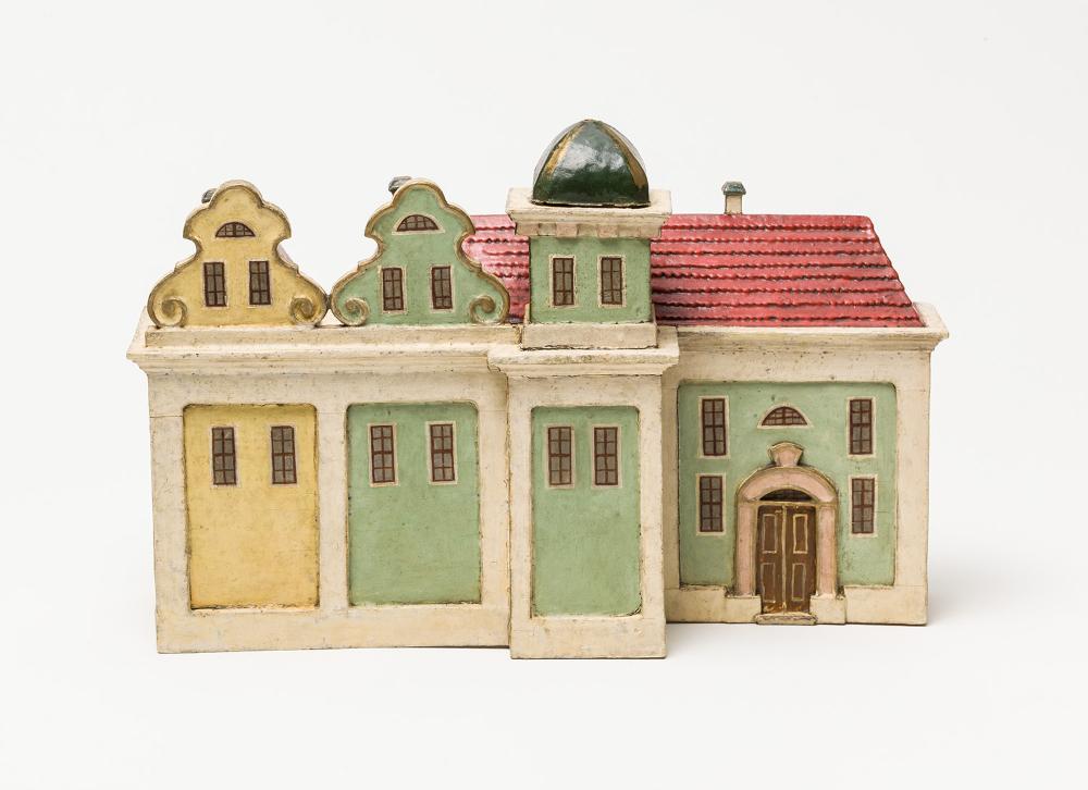 Fassadenreihe mit vorspringendem Türmchenelement, mit roten Dächern und zwei barocken Giebelelementen. Die Wände sind grün und ockerfarben, das Ensemble hat drei Schornsteine und ein braunes Tor.