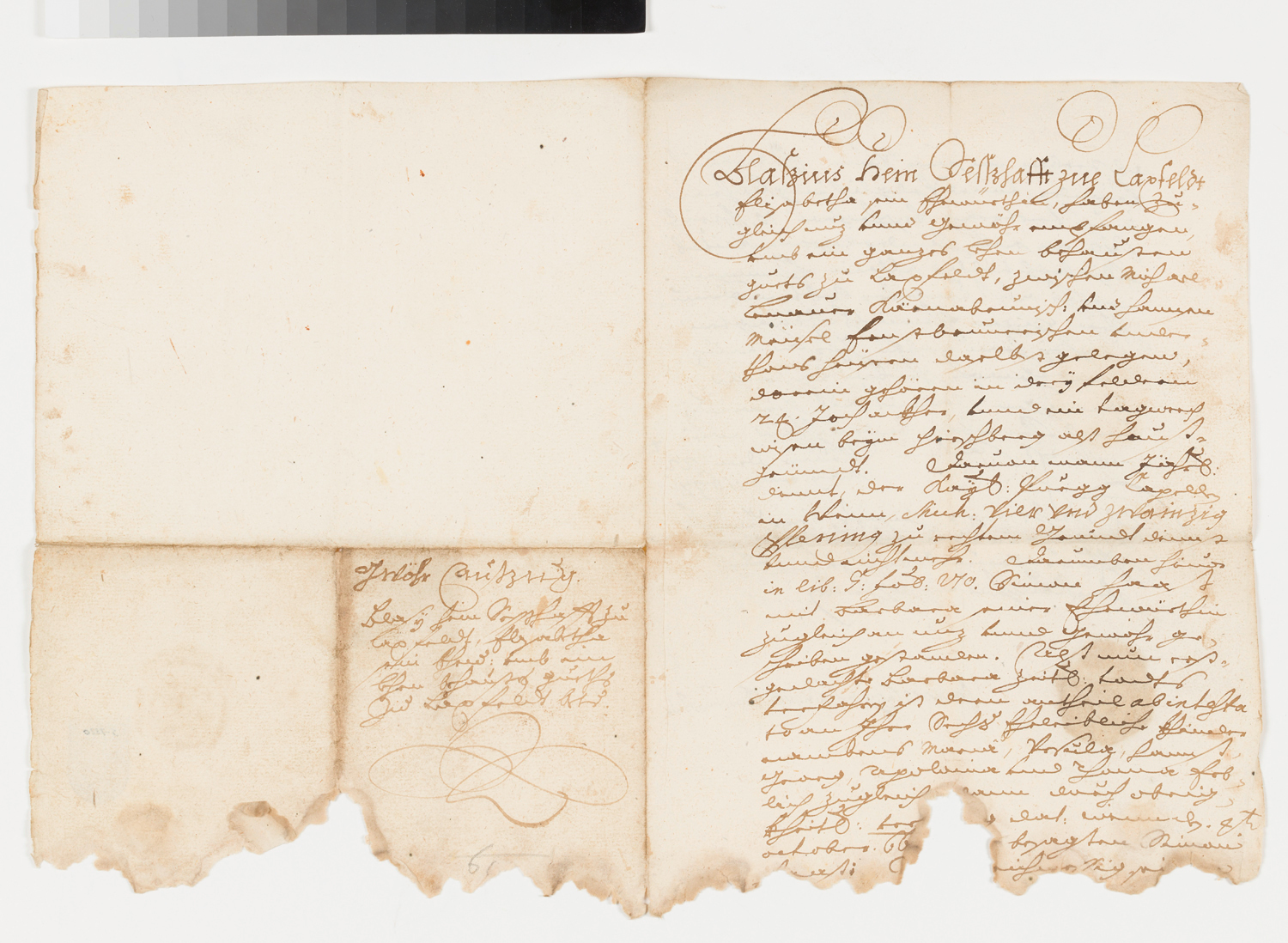 Technische Detailsalte Feuchtikeitsschäden am unteren Rand (durchgehend), 1 Siegel unter Papier