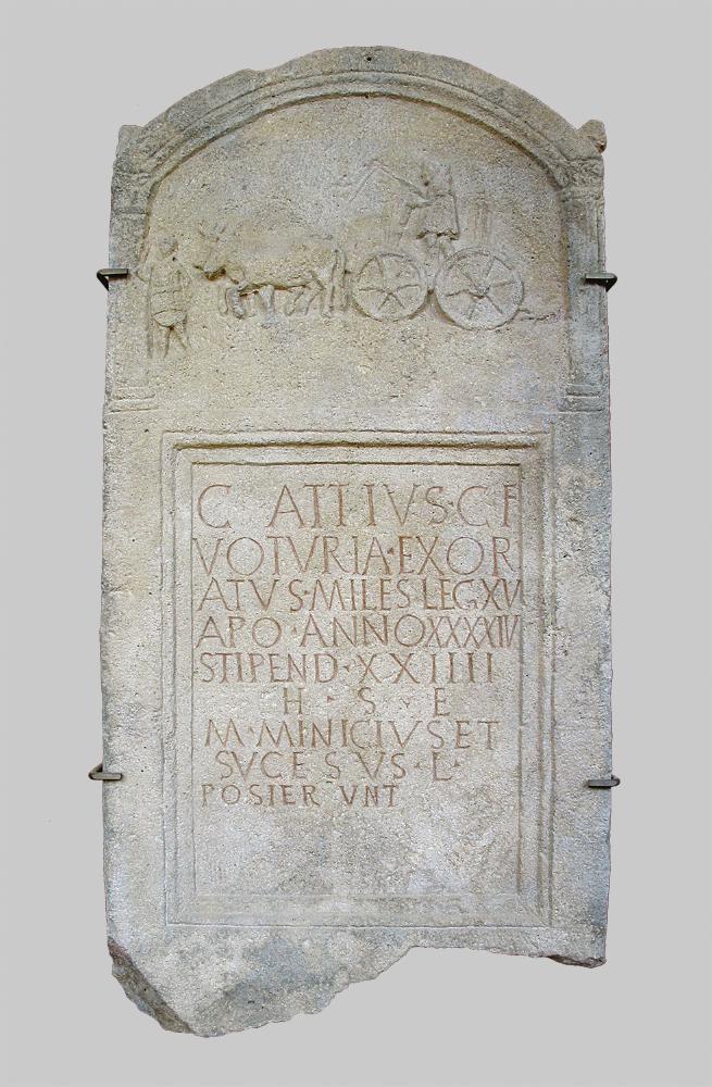 »Caius Attius Exoratus, Sohn des Caius, von der Tribus Voturia, Soldat der 15. Legion Apollinaris, 44 Jahre alt, 24 Dienstjahre, liegt hier begraben. Marcus Minicius und der Freigelassene Sucesus ließen den Grabstein setzen.«