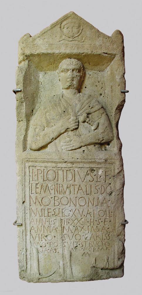 »Lucius Plotidius, Sohn des Lucius, von der Tribus Lemonia, aus Bononia, Soldat der 15. Legion Apollinaris, 50 Jahre alt, 23 Dienstjahre, liegt hier begraben. Annia Maxima hat ihrem liebsten Mann den Grabstein setzen und als Bauwerkzeuge Hacke (ascia) und Winkelmaß (norma) hinzufügen lassen.«