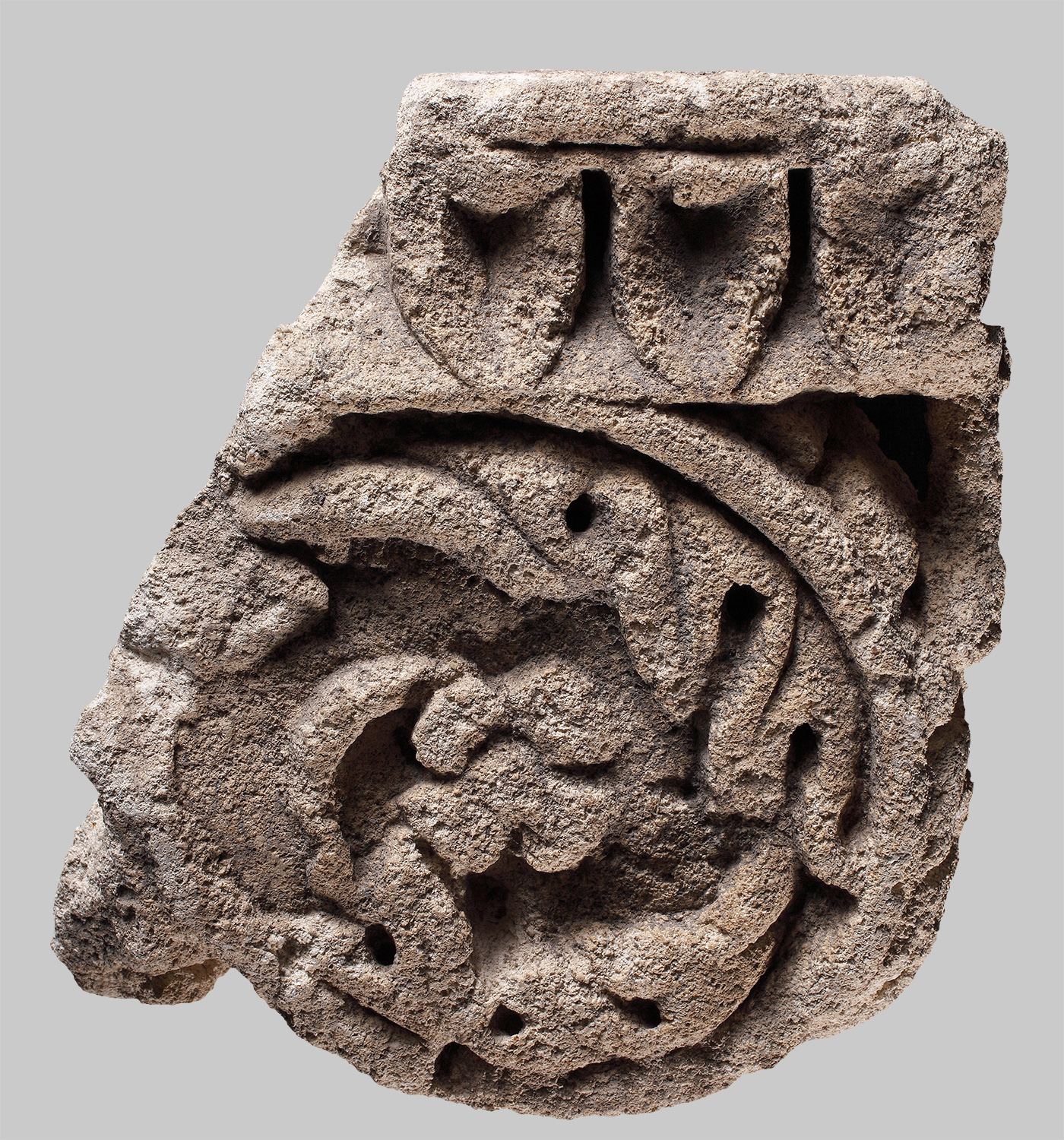 Von einem korinthischen Kapitell hat sich die Eckvolute mit einem Teil des darüber liegenden Abakus erhalten. Im Volutenkanal windet sich auf beiden Seiten eine Ranke, die im Volutenauge in einer blütenförmigen Rosette mündet. Auch die Stirnseite der Volute wird von einer Ranke (?) überdeckt. Der Abakus ist mit einem Schuppenstab verziert. Die schuppenähnlichen Blätter sind ohne Zwischenblatt gereiht und haben eingekerbtes Blattfleisch.