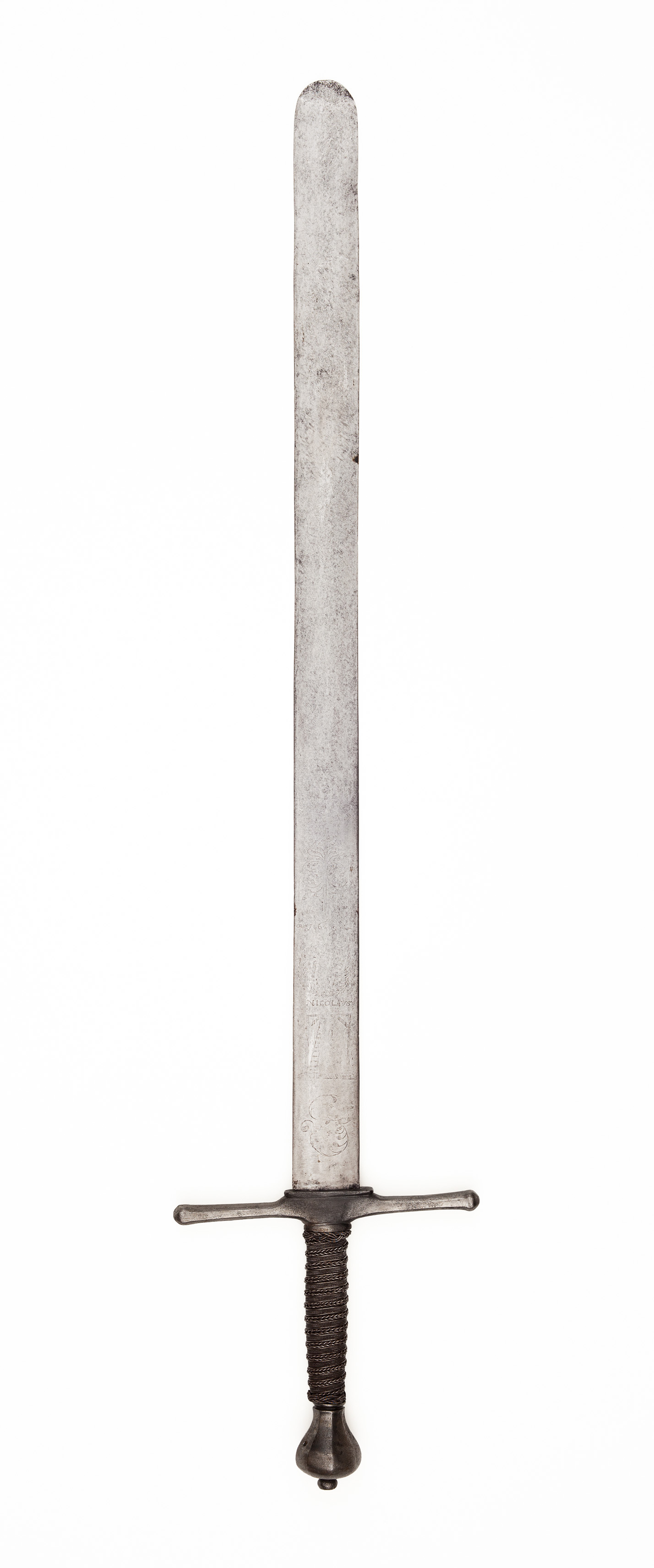 Achtkantiger Knauf und achtkantige Parierstange. Klinge beiderseits geätzt. Auf der einen Seite Palmettenmotiv, aufgerichtetes achtspeichiges Richtrad, der Name "Nikolaus", "Anno" und Palmettenmotiv. Auf der anderen Seite Palmettenmotiv, Jahreszahl 16XX, Galgen mit Leiter, der Name Morr und wieder Palmettenmotiv. Zugehörige Scheide Holz mit schwarzem Lederüberzug. Das Ortband ist aus Eisen und endet in einen kleinen Knopf. Die Scheide hat einen Tragwulst.