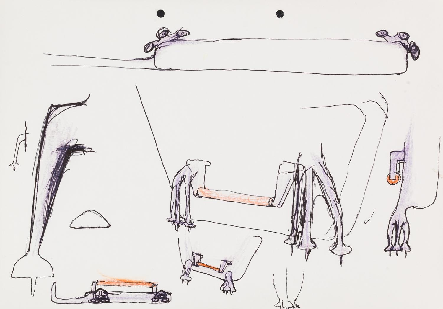 Kugelschreiber, Farbstift auf Papier