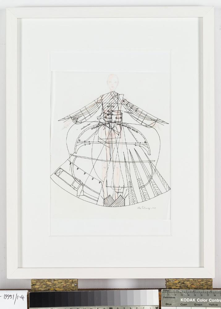 Bei der großformatigen Zeichnung „betrachtung“ und den vier Vorstudien dazu handelt es sich um eine Auseinandersetzung mit Velázquez‘ Gemälde „Infantin Margarita Teresa im blauen Kleid“ von 1659, das sich im Kunsthistorischen Museum in Wien befindet. Mit der überlebensgroßen, zart aquarellierten Zeichnung eines nackten Mädchenkörpers, der von einem aus Bootsteilen, Schnittmustern, Seilen und Miedern zusammengesetzten „Kleidkonstrukt“ umgeben wird, thematisiert die Künstlerin das Gefühl des Eingeengt- und Ausgeliefertseins.