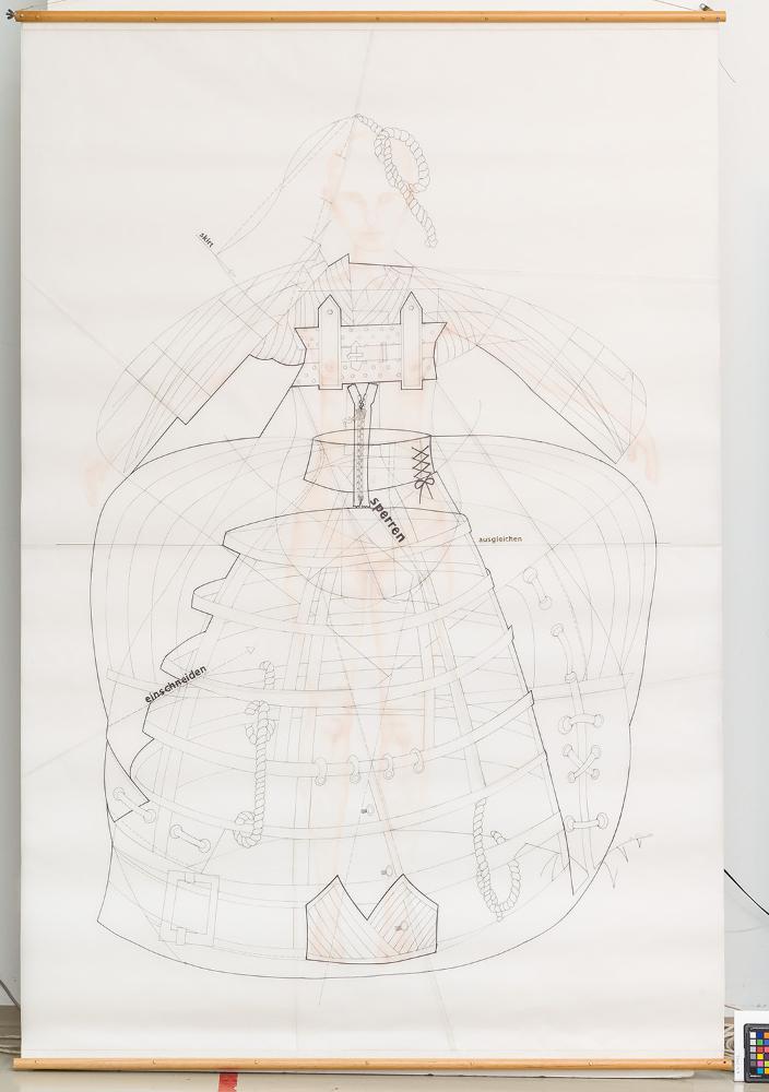 Bei der großformatigen Zeichnung „betrachtung“ und den vier Vorstudien dazu handelt es sich um eine Auseinandersetzung mit Velázquez‘ Gemälde „Infantin Margarita Teresa im blauen Kleid“ von 1659, das sich im Kunsthistorischen Museum in Wien befindet. Mit der überlebensgroßen, zart aquarellierten Zeichnung eines nackten Mädchenkörpers, der von einem aus Bootsteilen, Schnittmustern, Seilen und Miedern zusammengesetzten „Kleidkonstrukt“ umgeben wird, thematisiert die Künstlerin das Gefühl des Eingeengt- und Ausgeliefertseins.