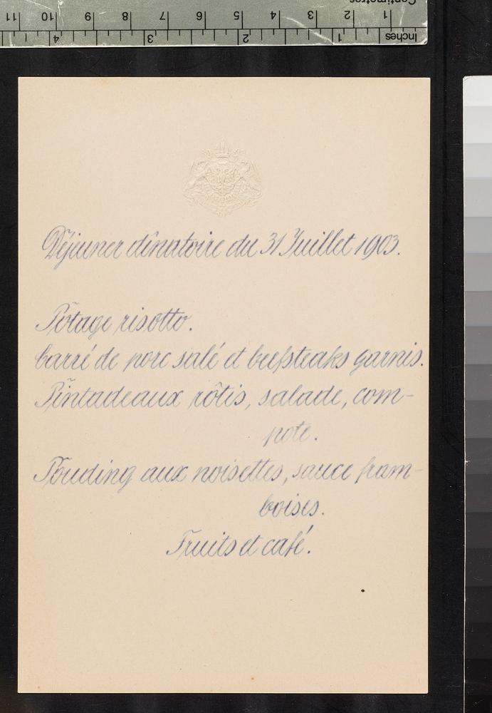 Faksimilierte Speisekarte für die Familientafel vom 31. Juli 1903, mit geprägtem kaiserlichen Wappen