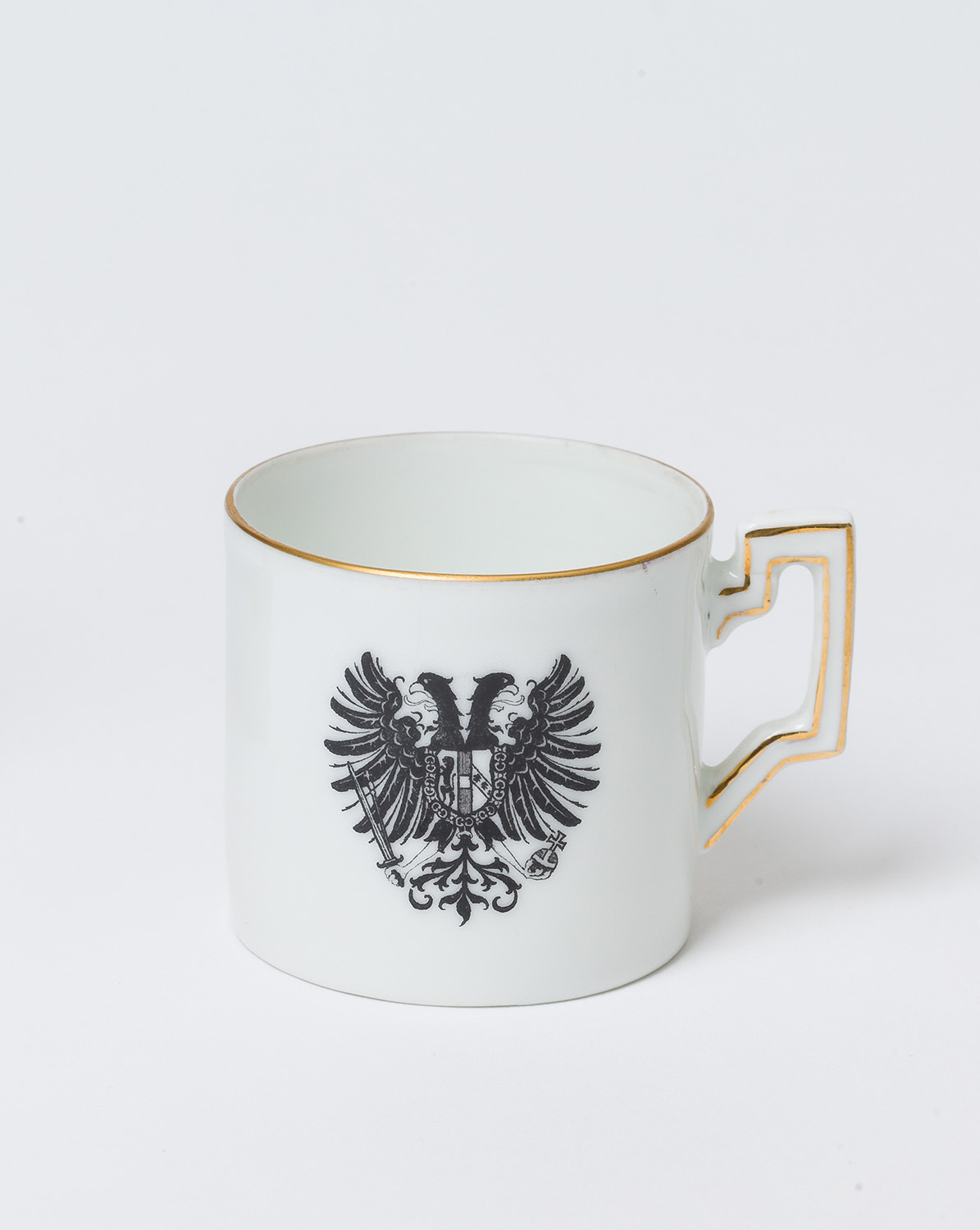 Kaiserlicher Hof - 6 Mokkatassen mit Untertassen. Porzellan weiß, Goldrand, Wandung und Fahne jeweils mit schwarzem kaiserlichen Doppeladler, Porzellanfabrik F. Thomas, Marktredwitz, Bayern, um 1914