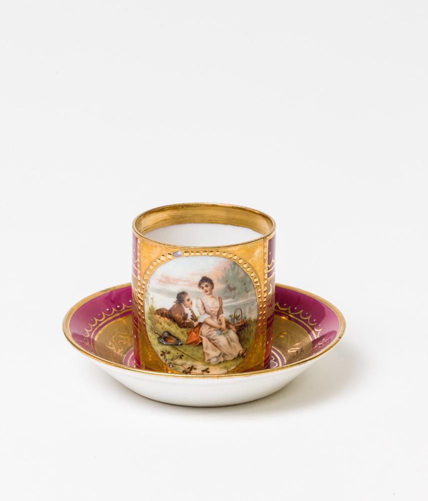 Kaiser Franz Joseph - Mokkaservice, Geschenk des Stiftes Lilienfeld anlässlich des Besuches von Kaiser Franz Joseph I., 9 Teile bestehend aus: Mokkakanne, Zuckerdose, 6 Mokkatassen mit Untertassen und Tablett, diverse galante Szenen in Drucktechnik, apokrypher Bindenschild, in Kassette, 1910.