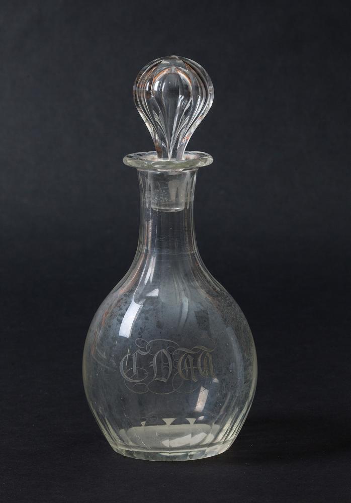 Karaffe mit zugehörigem Schliffstopfen aus der Villa Wartholz. Runde Karaffe mit gebauchter Wandung und facettiert geschliffenem Stand, Schulter und Hals. Gravierte Auftschrift. Schliffstopfen mit tropfenförmiger, facettiert geschliffener Handhabe.