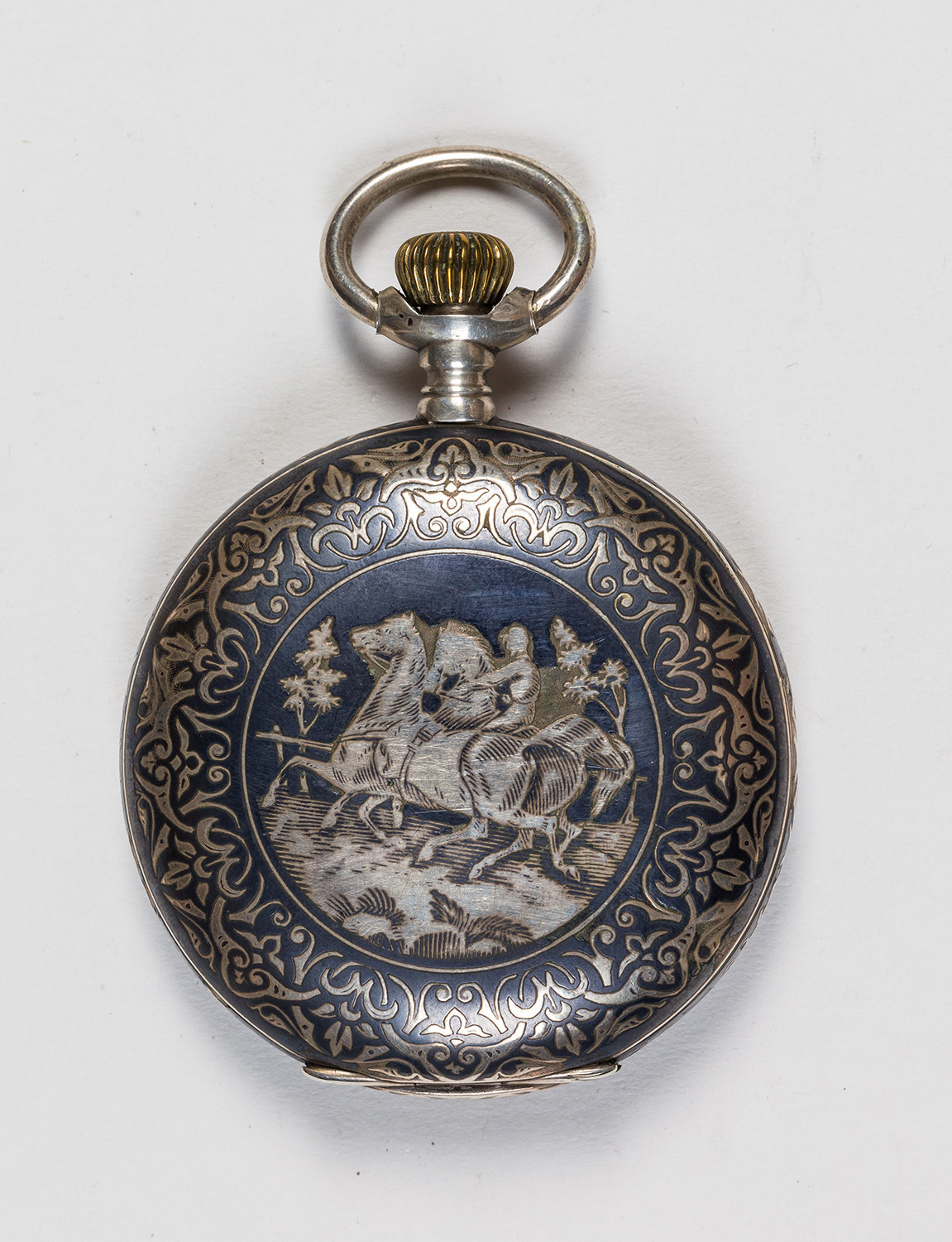 Geschenktaschenuhr. Savonette in Silber mit Dekoration in Niello. Motiv (zifferblattseitig Habsburger Doppeladler, werkseitig Reiterszenerie in Landschaft) umgeben von vegetabilem Dekor. 13-liniges Ankerwerk mit 23 Steinen und 3 verschraubten Chatons. Weißes Emailzifferblatt mit römischen Ziffern, goldenen Louis-XIV-Zeigern und kleiner Sekunde. Zugehöriges Etui außen mit lederimitierendem Prägepapier in Rot mit Goldgeprägtem Habsburger Doppeladler kaschiert, innen mit rotem Atlas beziehungsweise Samt ausgekleidet. Beschläge und Verschluss in Kupferlegierung gefertigt. Die 1891 von Henri-Frédéric Sandoz in Tavannes im Berner Jura gegründete Firma stellte mit modernsten Verfahren präzise Uhren her und fertigt noch heute für den amerikanischen Markt.