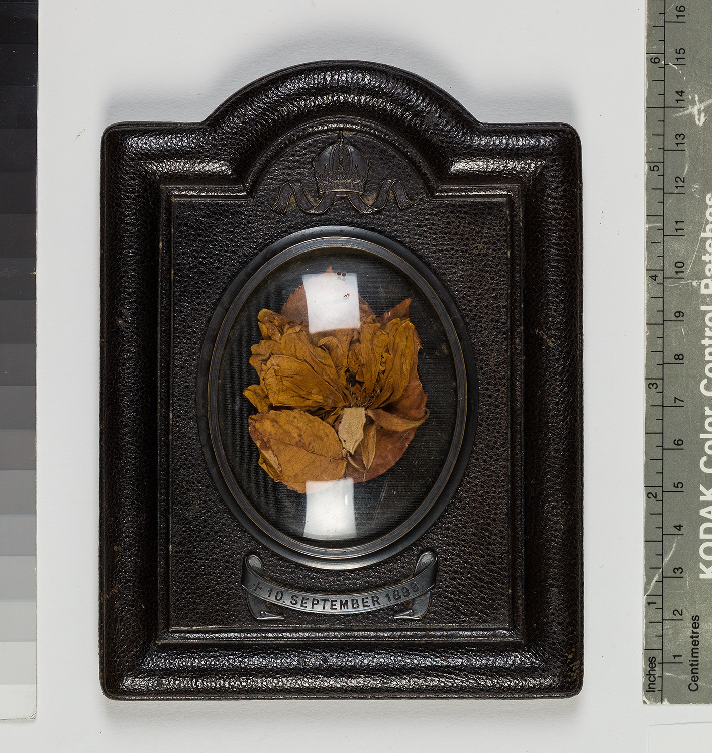 Rose vom Sterbelager der Kaiserin im Hotel Beau Rivage in Genf. In verglastem Rahmen auf Stellrahmen montiert, dieser schwarzes Leder mit geschwärzter Silbermontierung in Form der österreichischen Kaiserkrone und Datumsband: "+ 10. September 1898". Firmenzeichen des k.u.k. Hoflieferanten Gebr. Rodeck Wien. Nachlaß der Erzherzogin Maria Theresia (1855-1944), geb. Prinzessin von Braganza, Gemahlin von Erzherzog Karl Ludwig