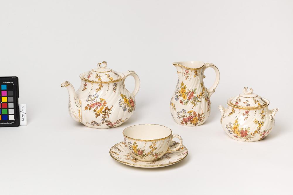 Katharina Schratt - Teeservice, 15 Teile bestehend aus: Teekanne, Milchkännchen, Zuckerdose, 6 Teetassen mit Untertassen, Keramik, farbiger Blumendekor, Goldrand, Manufaktur Utz Schneider, um 1910.