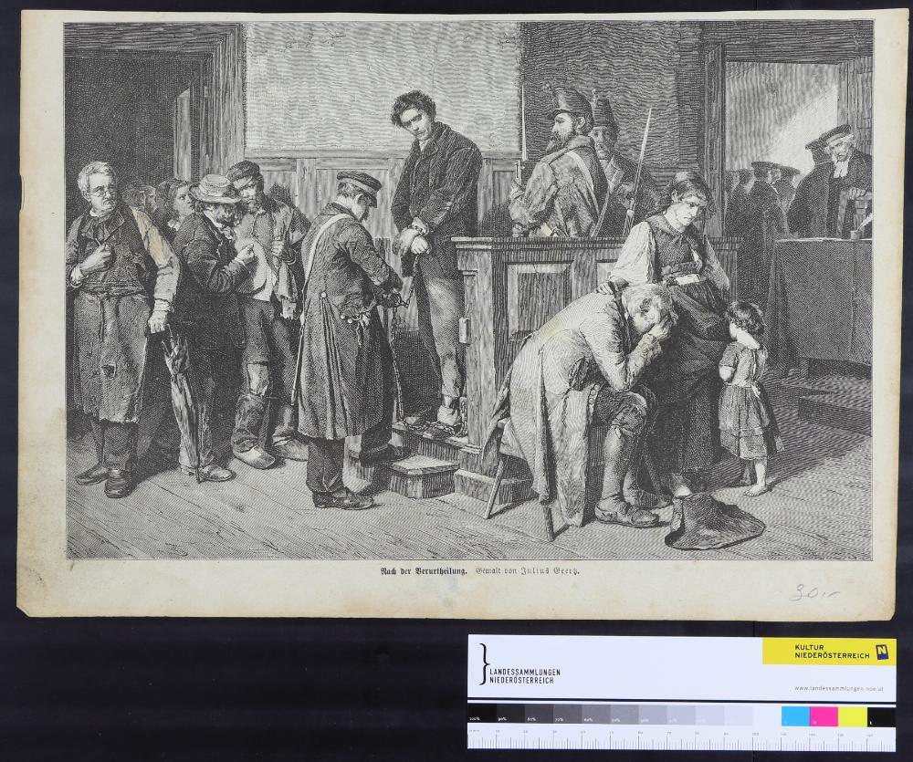 Das Bild zeigt die verschiedenen Gemütsbewegungen nach einer Verurteilung auf. Das Publikum wartet noch am Ausgang und äußert seine Empfindungen auf mannigfache Weise, wie eine Frau, die in Anteilnahme die Hände zusammenschlägt. Die übrigen Personen haben aber für den Verurteilten kein Mitgefühl.