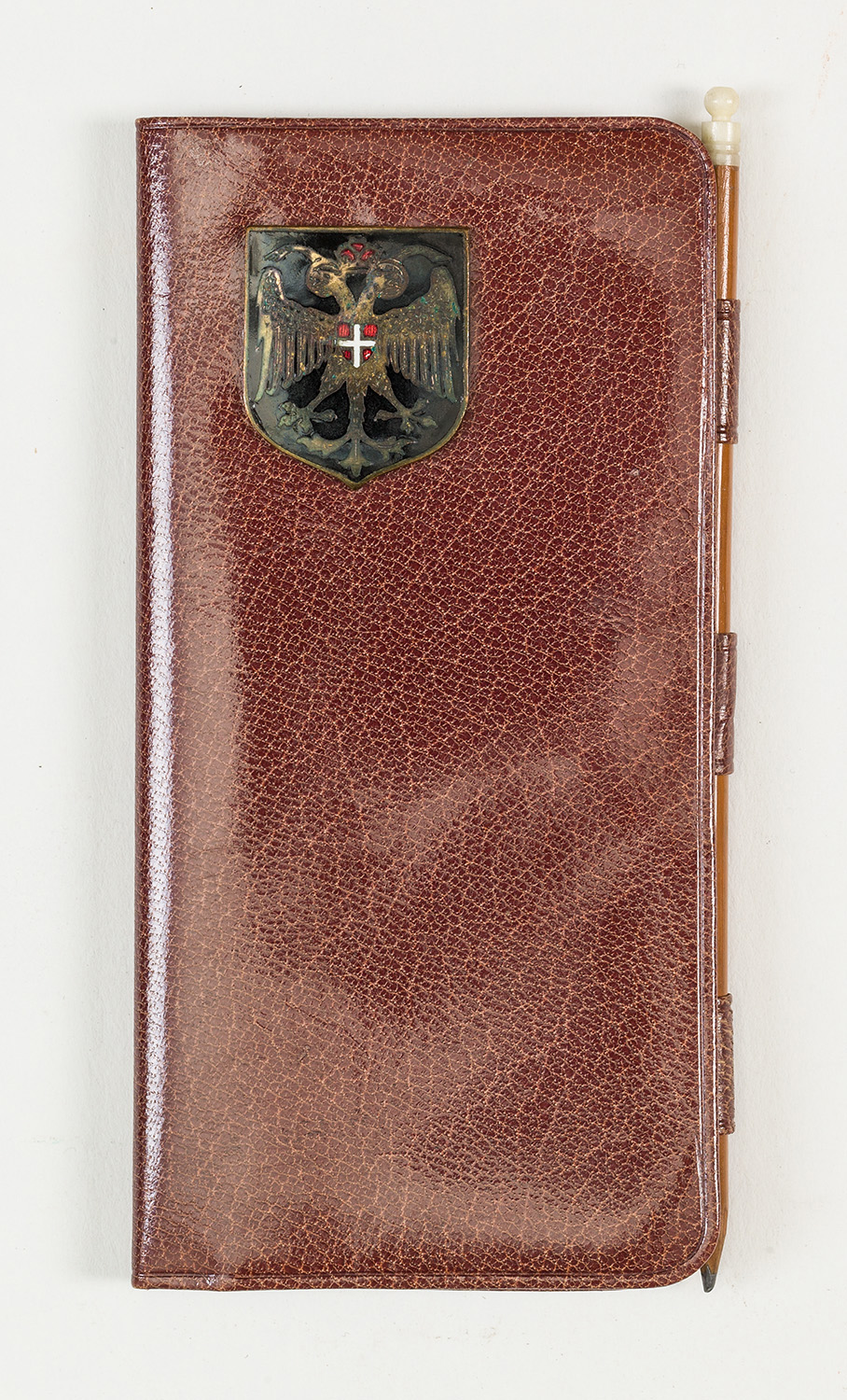 Taschen-Necessaire aus dem Besitz Karl Luegers. Innen mehrere Einschübe für Utensilien, in verchromte Kupferlegierung gefasster Spiegel sowie Bleistift als Verschluss. Vermutlich Ehrengabe der Stadt Wien.