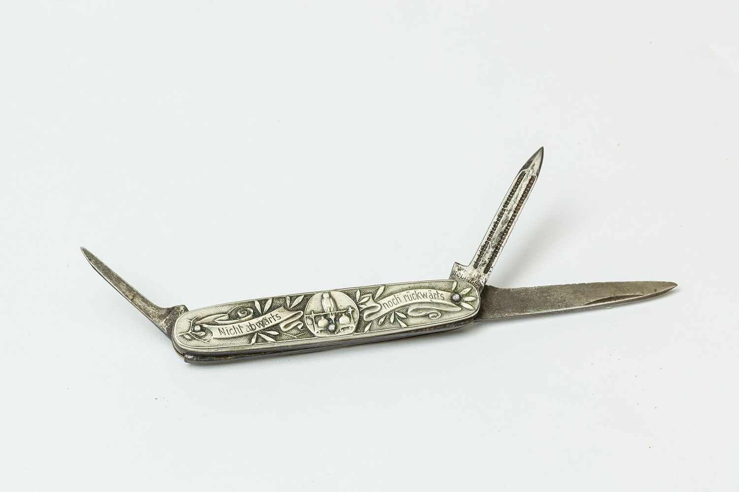 Karl Lueger - persönliches Taschenmesser. Metall, versilbert, gravierter Wahlspruch "Nicht abwärts noch rückwärts sondern aufwärts und vorwärts", um 1860. Aus der Studentenzeit des Bürgermeisters.