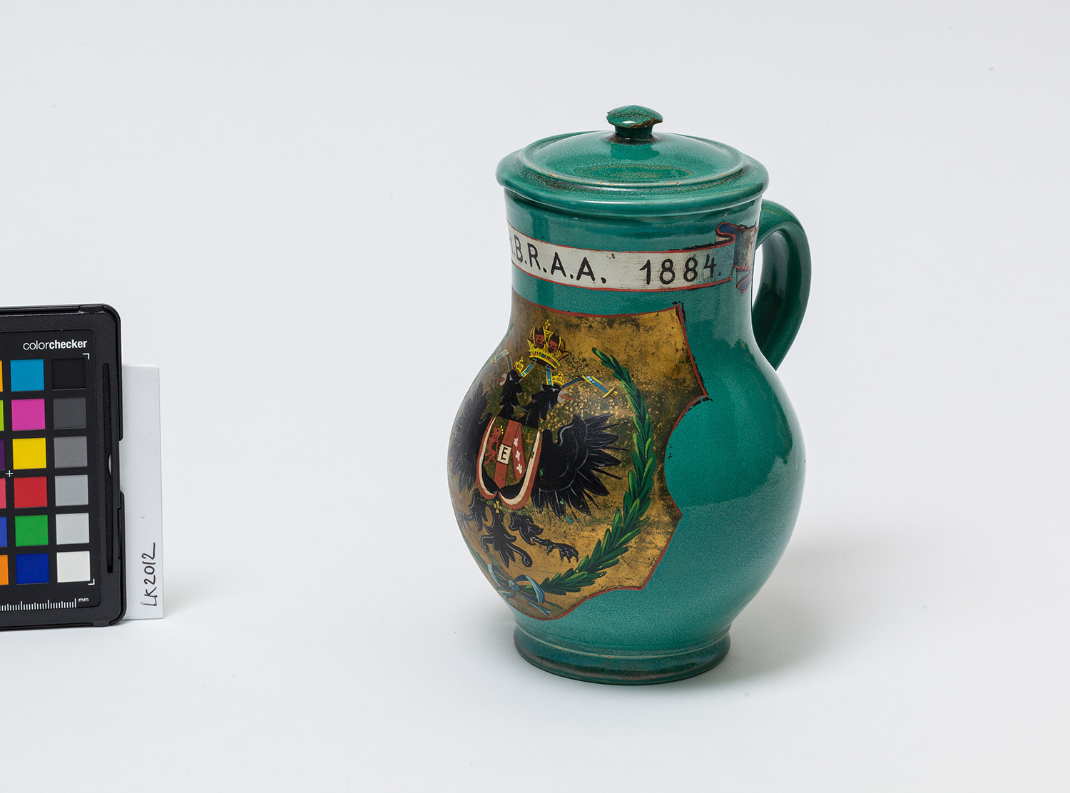 Kaiserin Elisabeth - Fußwaschungskrug 1884. Keramik, grün glasiert, rund gebaucht, Wandung mit gemaltem kaiserlichen Doppeladler und Schriftband "E.A.I.H.B.R.A.A. 1884" = Elisabeth Austriae Imperatrix Hungariae Bohemiae Regina Archiducessa Austriae. Henkel, mit Deckel