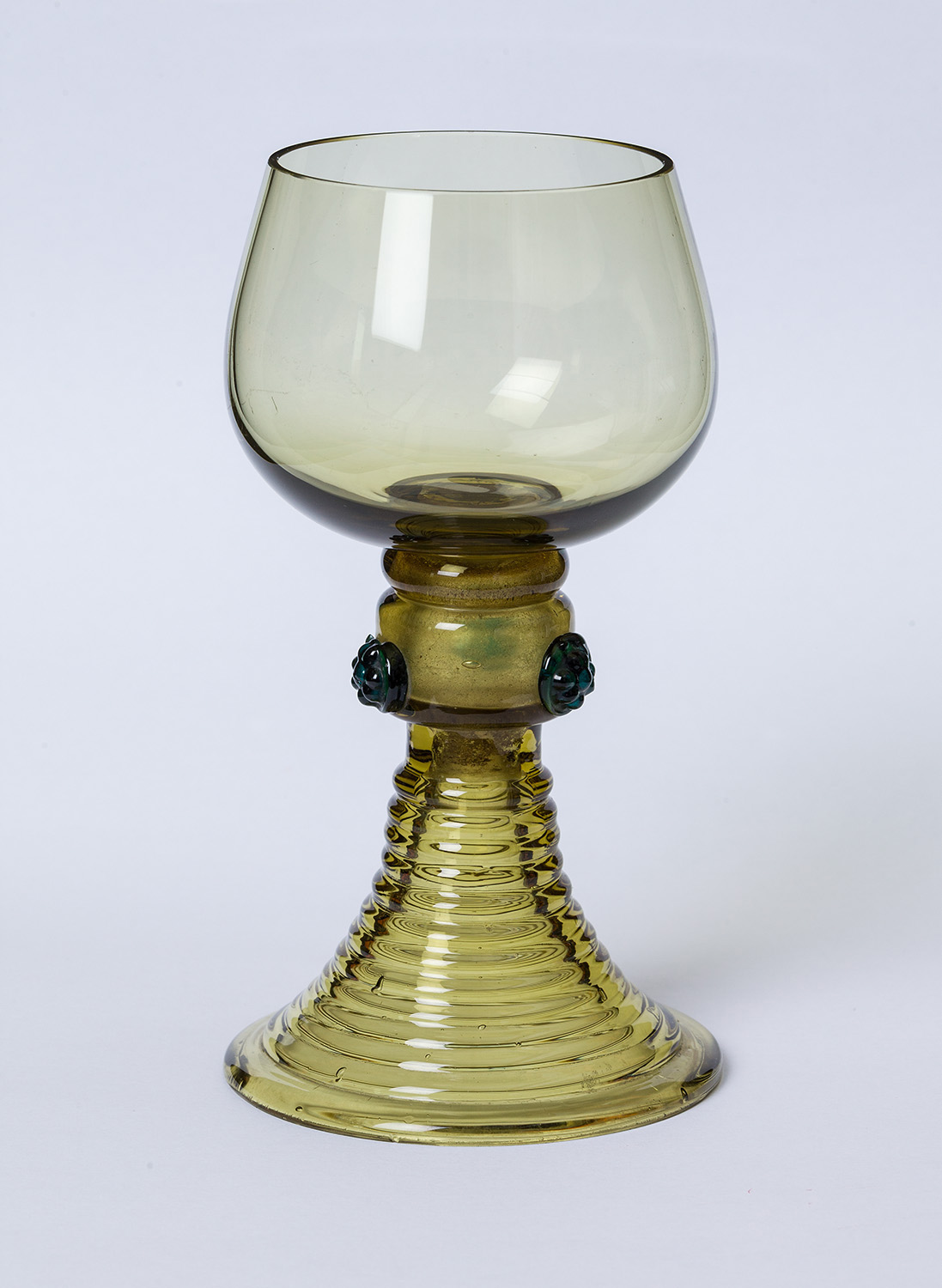 Kaiser Karl I. - 14 Weingläser aus dem Bestand der Villa Wartholz in Reichenau an der Rax - Grünlich/gelbliches Glas, aufgeschmolzene blaue Rosetten, gerillte Fußzone, um 1875. Die Villa Wartholz wurde von Heinrich von Ferstel im historistischen Stil zwischen 1870 und 1872 für Erzherzog Karl Ludwig gebaut, später von Kaiser Karl und Kaiserin Zita genützt. Kronprinz Otto wurde in der Villa Wartholz geboren und getauft. Die Ausstattung der Villa, zu der diese Gläser gehören, wurde von Heinrich von Ferstel mit entworfen.