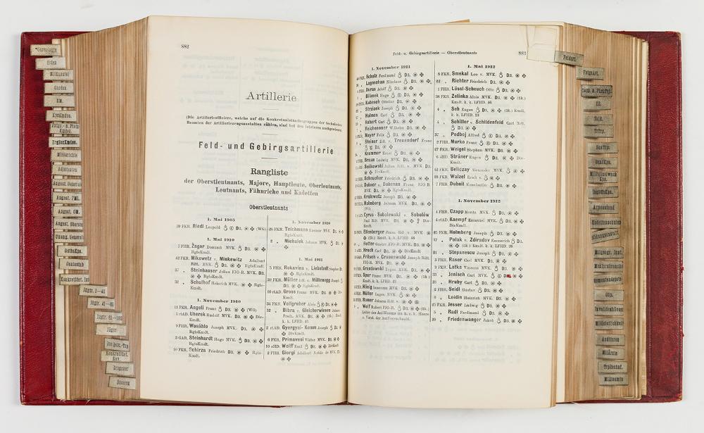 Persönlicher Schematismus für das k.u.k. Heer und für die k.u.k. Kriegsmarine 1913. Roter Ledereinband mit reicher Goldprägung, aufgelegter kaiserlicher Doppelalder in vergoldetem Metall, Fingerregister, 1913. Persönliches Handexemplar Kaiser Franz Joseph I. Die Ausführung wurde speziell für den Kaiser in der jährlichen Ausgabe gefertigt.