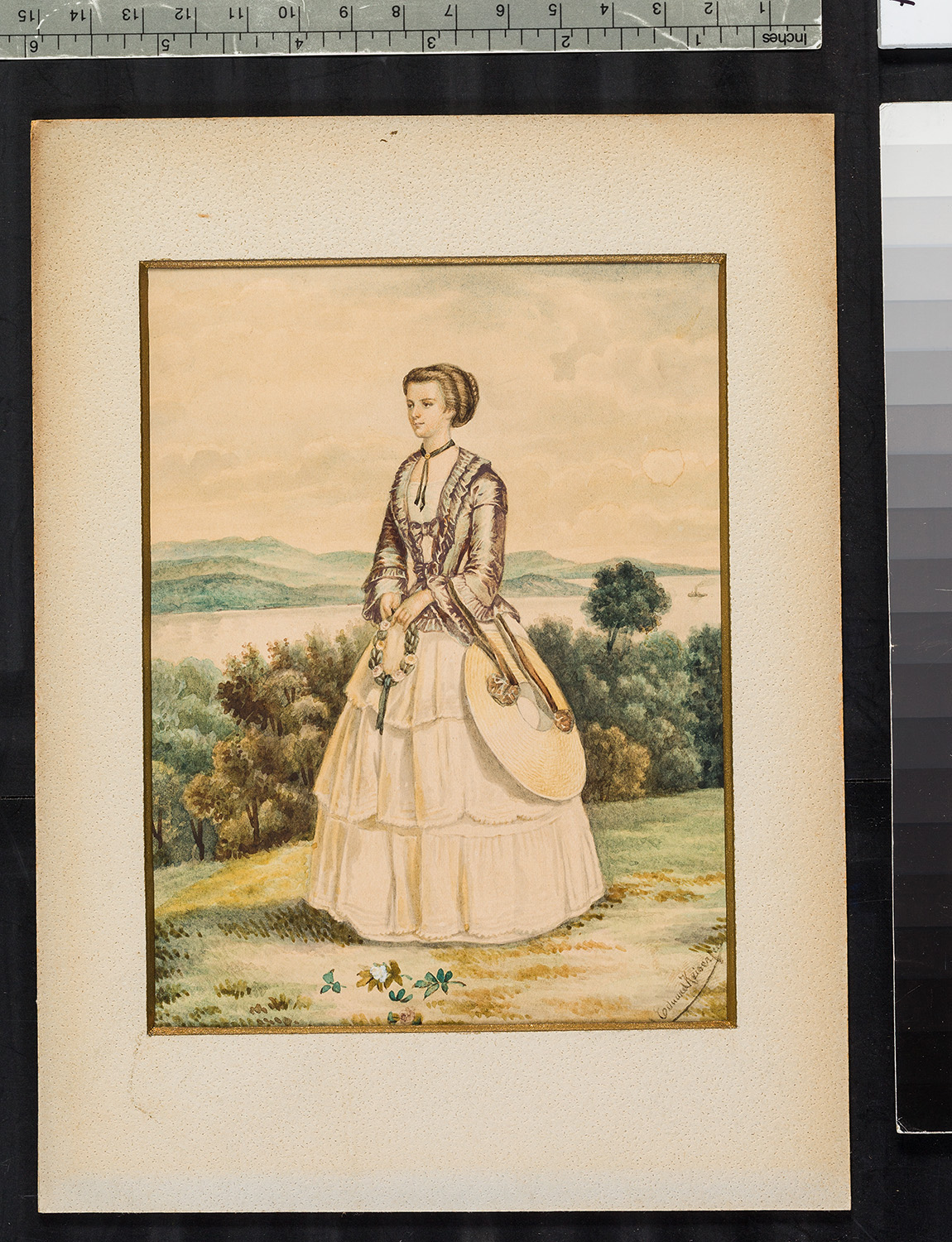 Portrait der jungen Kaiserin vor dem Starnberger See, Aquarell auf Karton, signiert "Eduard Kaiser", Passepartout, verglast und gerahmt, um 1854