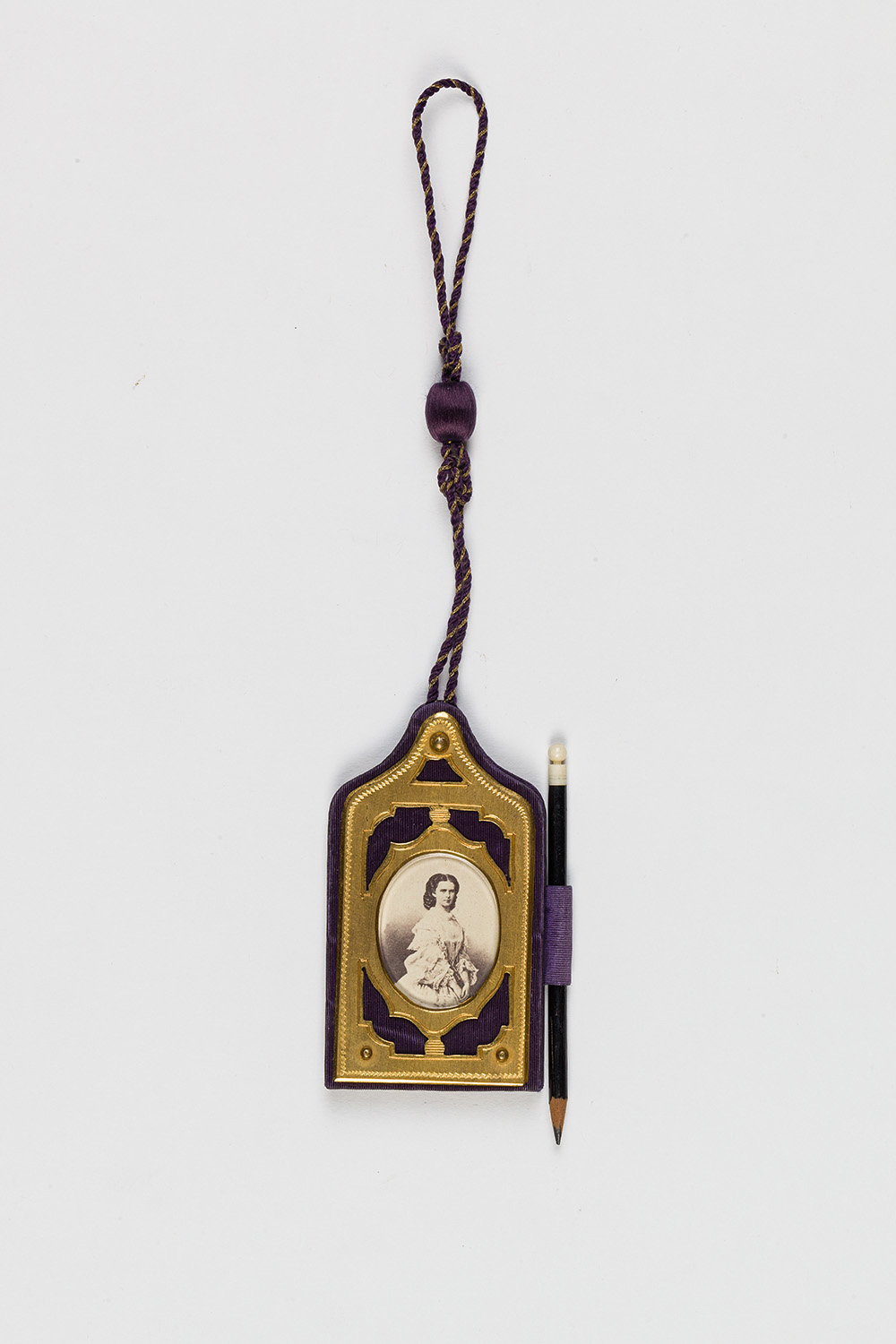 Kaiserlicher Hof - Hofballspende. In Form eines auffächerbaren Notitzbüchleins mit Bleistift und mit einem photographischen Portrait der Kaiserin Elisabeth im weißen Spitzenkleid