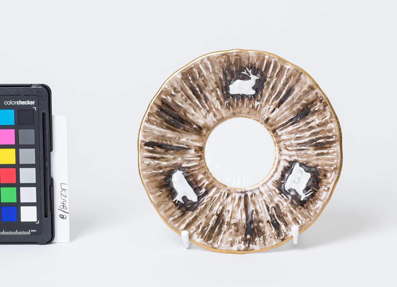 Kaiserlicher Hof - Untertasse zur Kaffeetasse, aus dem Krickerlservice der kaiserlichen Jagdhäuser. Bestehend aus Kanne, Zuckerdose und zwei Tassen mit Untertassen, imitiertes Krickerldekor sowie Hirsch und Rehbockdarstellungen, Böhmen, um 1860.