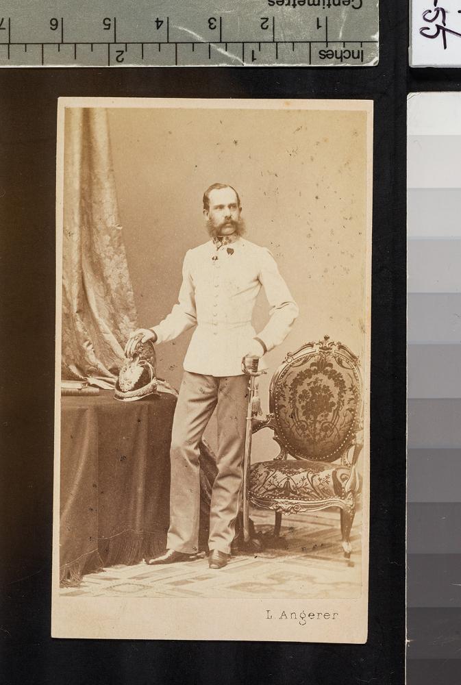 Österreichisches Kaiserhaus - Fotosammlung. Fotografie des Kaisers, ganzfigurig stehend in Dreiviertelprofil, in weißer Campagneuniform