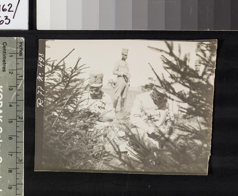 mehrere Soldaten hinter Nadelbäumen zur Deckung
