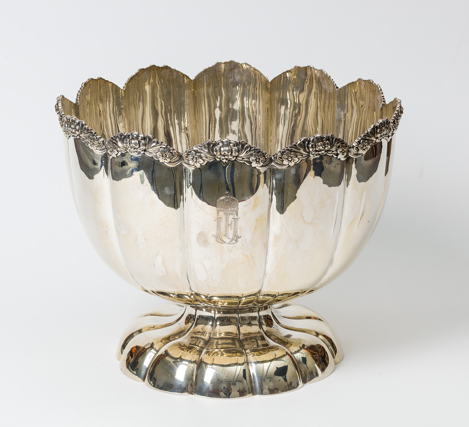 Kaiser Franz Joseph als König von Ungarn - Champagnerkühler aus dem ungarischen Service. Silber, rund, gerade Faltenzüge, floraler Rand, Wandung mit graviertem Monogramm "FJ I" mit darüberliegender St. Stephanskrone, Firmenzeichen ABA = A. Bachruch, Budapester Dianakopfpunze ab 1872, um 1910. Seltener großer Champagnerkühler aus dem persönlichen Tafelservice Kaiser Franz Josephs als König von Ungarn