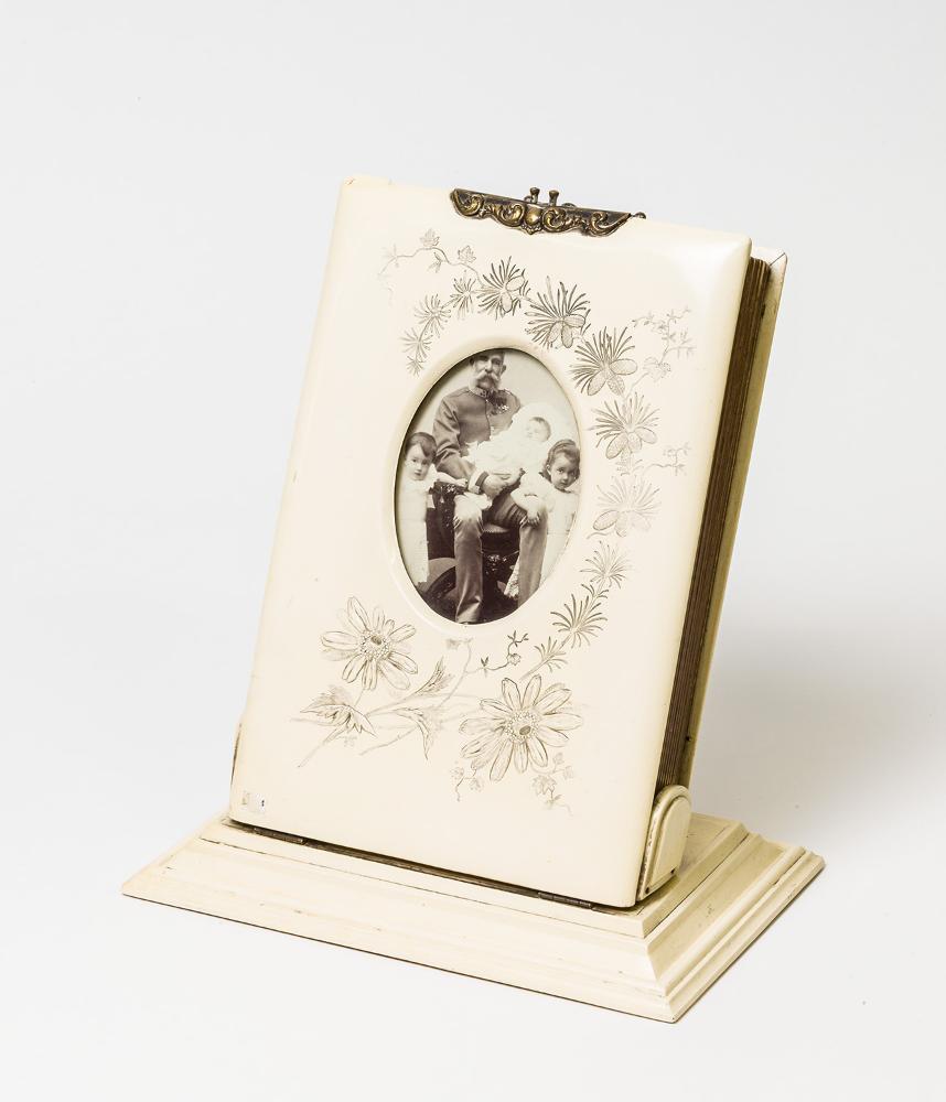 Persönliches Fotoalbum als Kulissenalbum mit 28 Fotos in Kabinettformat der kaiserlichen Familie, einiger Hofdamen sowie verschiedener Mitglieder europäischer Herrscherhäuser; am Boden zwei Klebeetiketten: "Eigenthum I.M. Kaiserin Elisabeth" sowie "Kammer Ihrer k. u. k. Hoheit der dl. Frau Erzherzogin Marie Valerie", um 1889