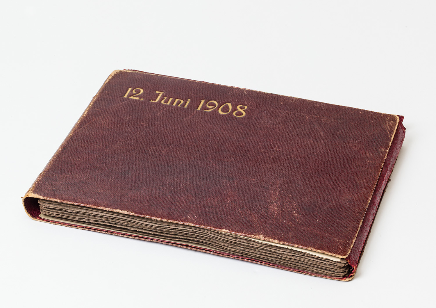 Fotoalbum zum Kaiserhuldigungsfestzug, Wien 12. Juni 1908, 38 Fotos auf dunkle Untersatzkartons kaschiert, unterteilt in Nationalitätengruppen und historische Gruppen, 2 Beiblätter, "Kommissionsverlag: Würthle & Sohn Nachf. G.M.B.H. Wien, I."