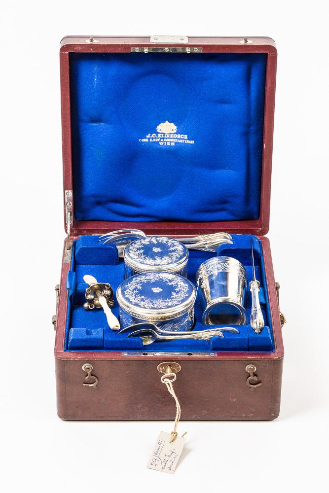 Kaiserin Elisabeth - Taufgarnitur für ihre Enkelin Erzherzogin Elisabeth ("Ella"), Tochter Erzherzogin Marie Valeries und Erzherzog Franz Salvators. Silber, tw. Innenvergoldung. 11 Teile bestehend aus: Unterteller, Schale, Becher, eine runde Dose aus farblosem Glas mit silbernem Steckdeckel, eine runde Dose aus Silber mti Steckdeckel, Suppen-, Tee-, Mokkalöffel, 1 Fleischgabel, Fleischmesser, 1 Kinderrassel mit Pfeife. Alle Teile außer der Rassel mit Erzherzogskrone. Meisterzeichen J.C. K. = J.C. Klinkosch, Wiener Dianakopfpunze 1872-1922. In originaler Lederkassette mit gravierter Erzherzogskrone.