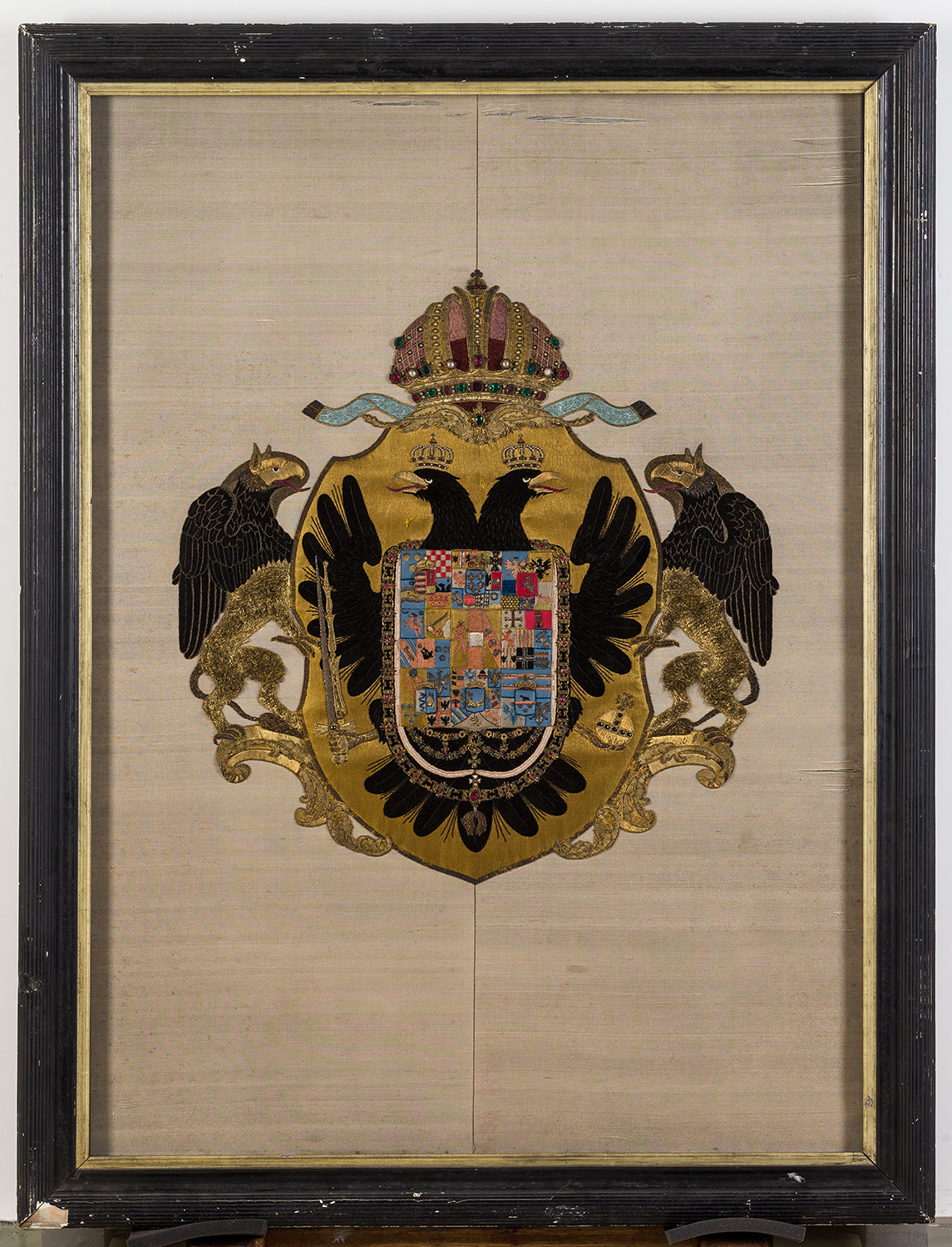 Großes Wappen Kaiser Ferdinand I von Österreich. Neungeteiltes Schild, in der oberen Reihe die Besitzungen in Böhmen, Mähren und Schlesien, in der Mittleren Reihe die österreichischen Besitzungen mit Wappen des des Hauses Habsburg im Zentrum, in der Unteren Reihe die Besitzungen in Lombardei, Lothringen und Sizilien. Darunter mehrere Collanen zu verschiedenen Orden. Großer gekrönter Doppeladler mit Schwert, Szepter und Reichsapfel. Zwei einander zugewandte Greife als Schildträger, zuoberst Kaiserkrone mit blauen Pendilien. Vermutlich ursprünglich Mittelteil eines Banners beziehungsweise Teil einer textilen Raumausstattung und später auf einen Leinwandträger appliziert sowie gerahmt.