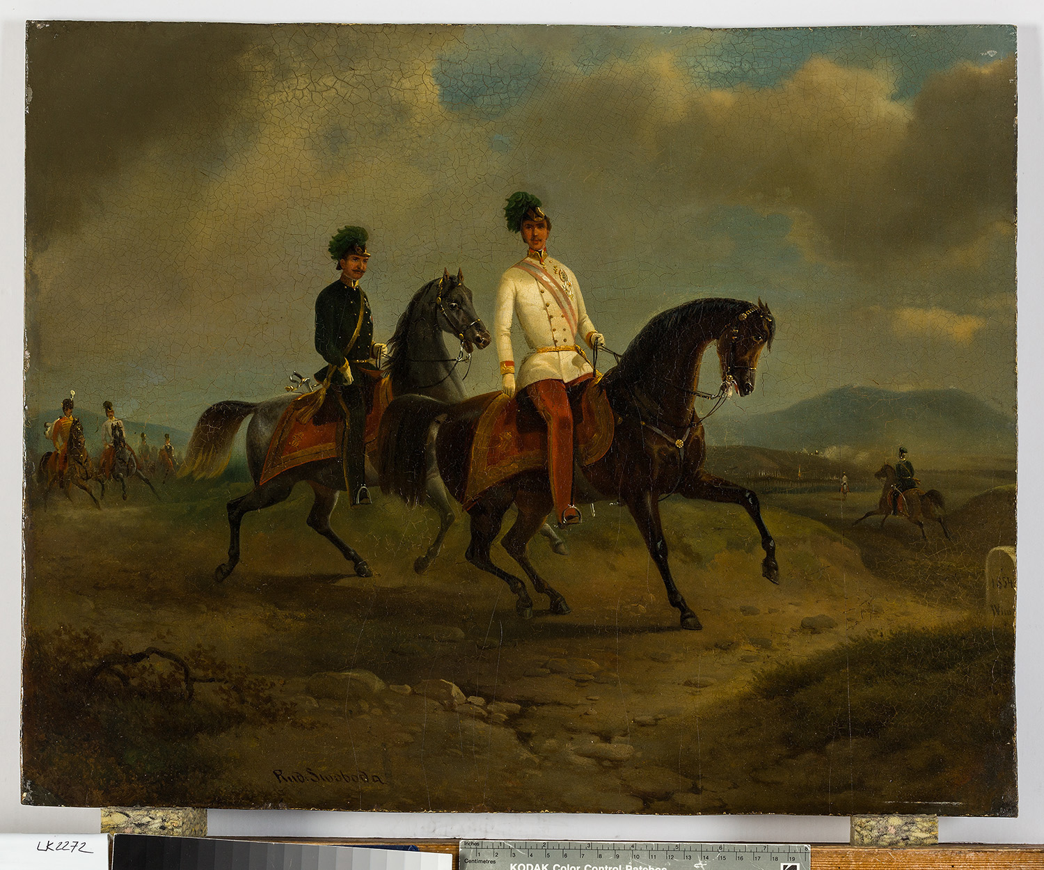 Reiterportrait des jungen Kaisers Franz Joseph I mit seinem Generaladjudanten Karl Ludwig Grünne, Graf von Pinchard zu Pferd. Das Portrait zeigt den Kaiser im Jahr seiner Vermählung mit Elisabeth, Herzogin in Bayern. Ihm im Feld folgend Karl Ludwig Grünne, derzeit sein Generaladjudant und ab 1850 als Feldmarschallleutnant Leiter der kaiserlichen Militärkanzlei. Nach den Niederlagen im sardinischen Krieg wurde er vom Kaiser in Gnaden seiner Ämter enthoben, uno actu zum Oberststallmeister ernannt und ihm das Großkreuz des St.-Stephans-Ordens verliehen. Ab 1865 Inhaber des Ulanenregiments Nr. 1 wurde er zum Ritter vom Orden des Goldenen Vlieses geschlagen. Das Gemälde ist allerdings späteren Datums, da Rudolf Swoboda zur Zeit der angeblichen Entstehung des Gemäldes noch nicht geboren war.