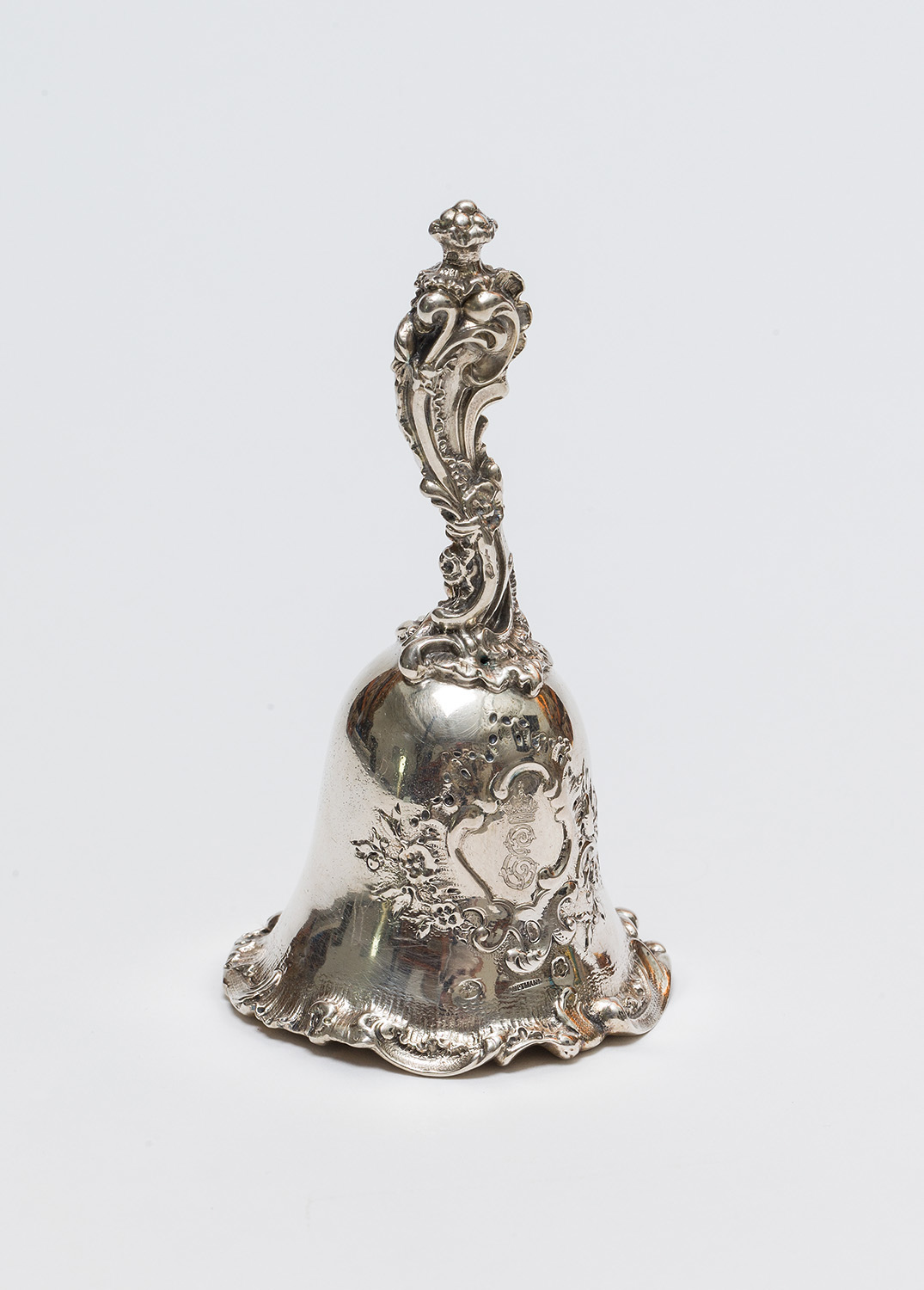 Eine Tischglocke der Kaiserin Elisabeth. Ornamental stark ausgeprägte Handhabe, Rand und Gravurfeld in der Formensprache des Neorokoko.