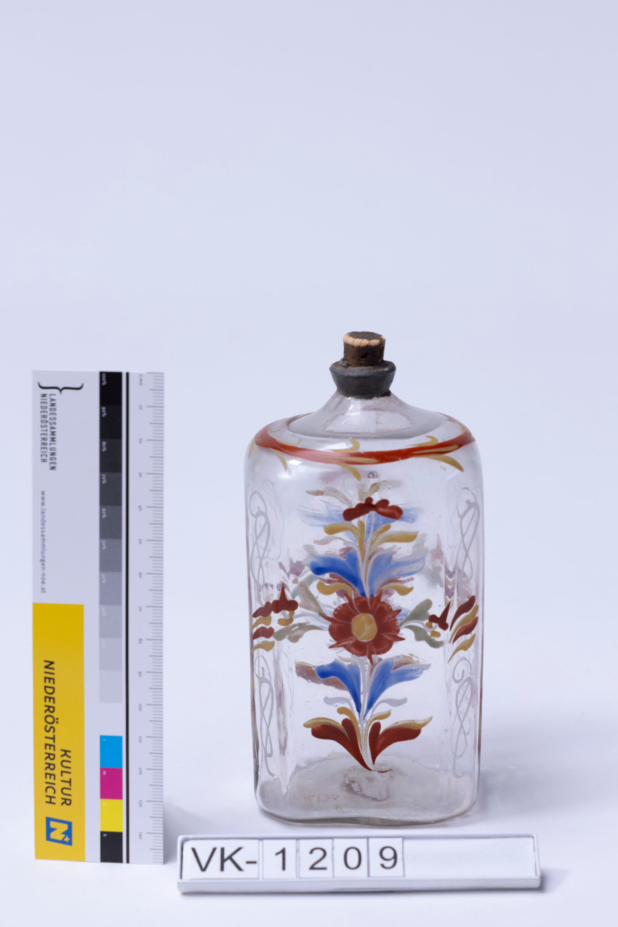 Kleine, mit Emailmalerei (mehrfärbig, florales Muster) bemalte Schnapsflasche mit annähernd achteckiger Grundfläche und einem zinnarmierten Hals mit Korkstöpsel.