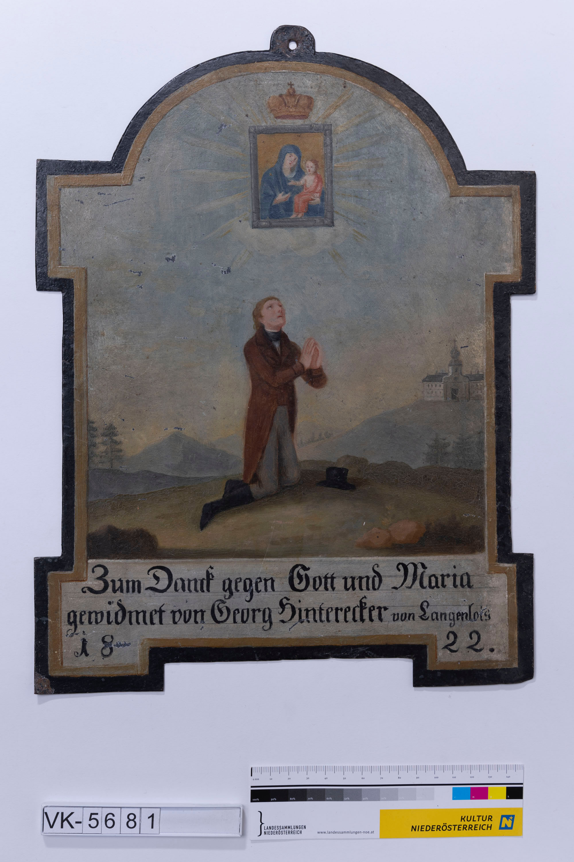 Votivbild auf Metallplatte mit Darstellung eines betenden Mannes in einer Hügellandschaft, im Hintergrund Kirche, im Himmel Maria mit Kind. Aufschrift: "Zum Dank gegen Gott und Maria gewidmet von Georg Hinterecker von Langenlois 1822". Auf der Rückseite Fragmente eines Textes auf Papier.