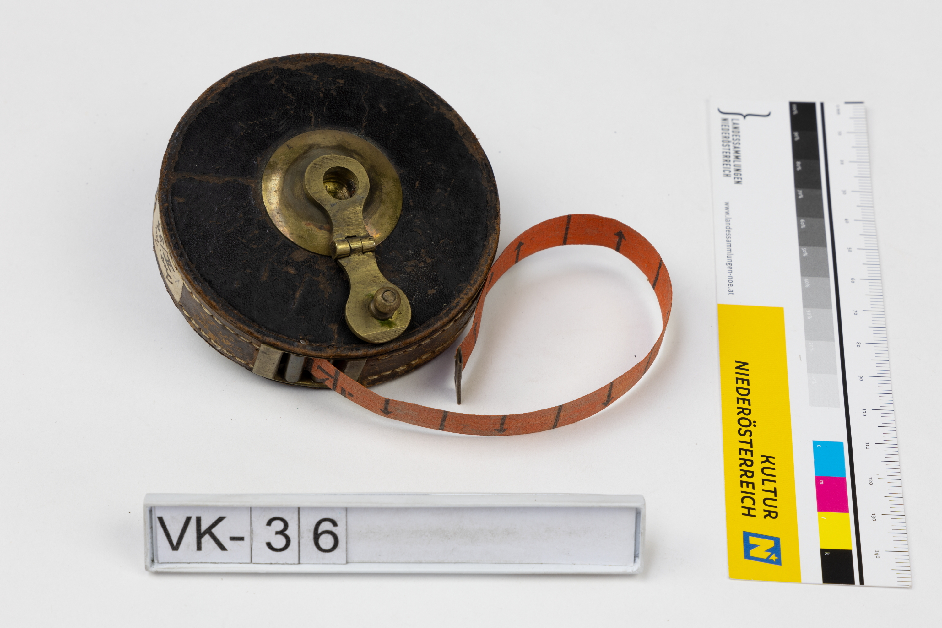 Oranges Maßband in einer runden lederbezogenen Dose mit klappbarer Messingkurbel.