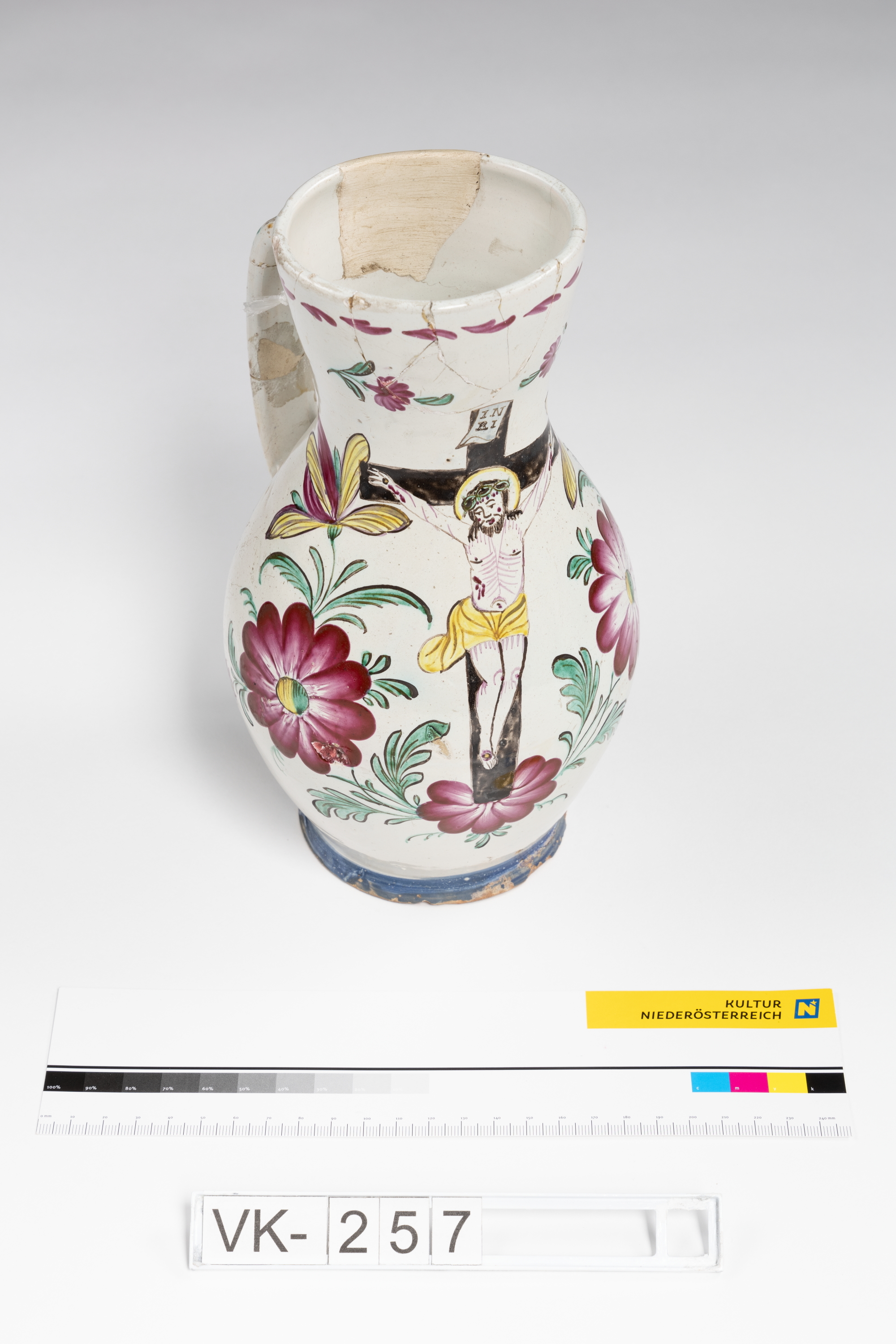 Bauchiger Krug mit unterrandständigem Bandhenkel. Der Krug ist großflächig mit roten Blüten und Blattwerk verziert, an der Vorderseite befindet sich ein Kruzifix.