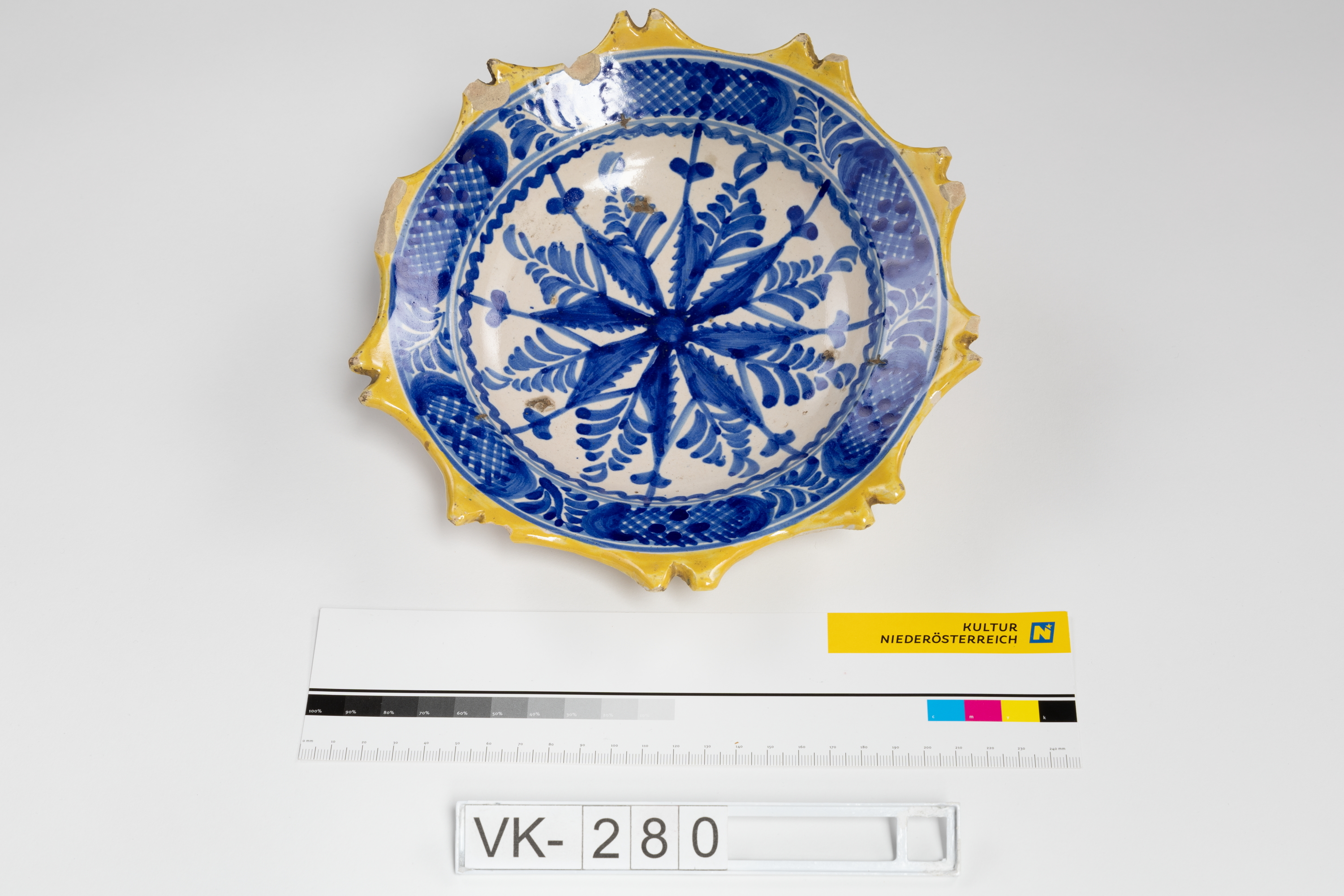 Teller mit blauem Dekor (GItterelmente auf der Fahne, Stern am Spiegel) mit gezacktem gelb glasierten Rand.