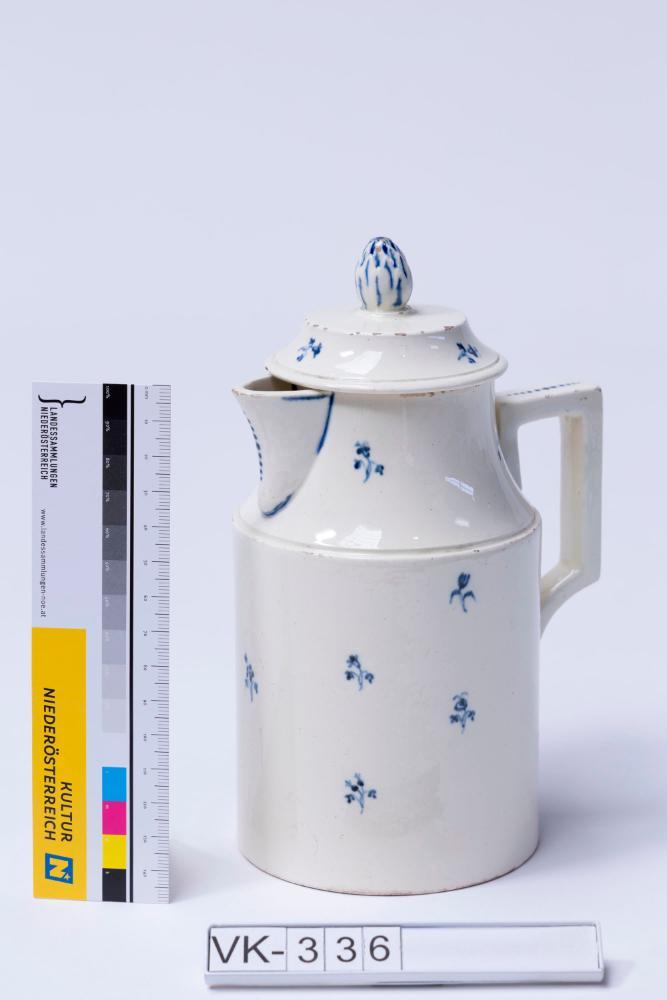 Biedermeierliches Kännchen (VK-336a) mit kantigem Henkel, Ausguss und einem Deckel (VK-336b) mit zapfenförmigem Knauf. Kännchen und Deckel sind mit kleinen floralen Motiven verziert.