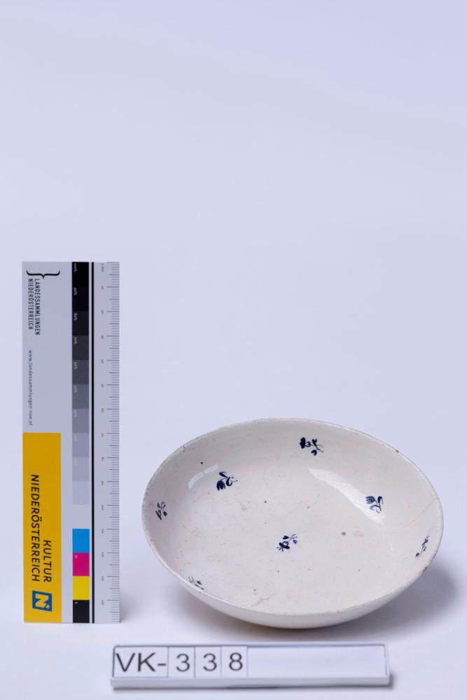 Weiß glasierter Teller mit kleinen, blauen, floralen Motiven.