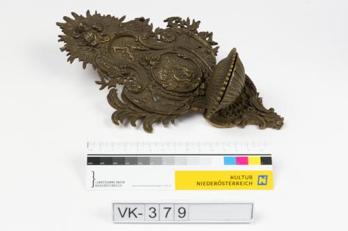 Weihbrunnkessel aus Metall mit ornamentaler Verzierung, muschelförmigem Weihwasserbecken mit Deckel und einer Reliefdarstellung (Kreuzigung).