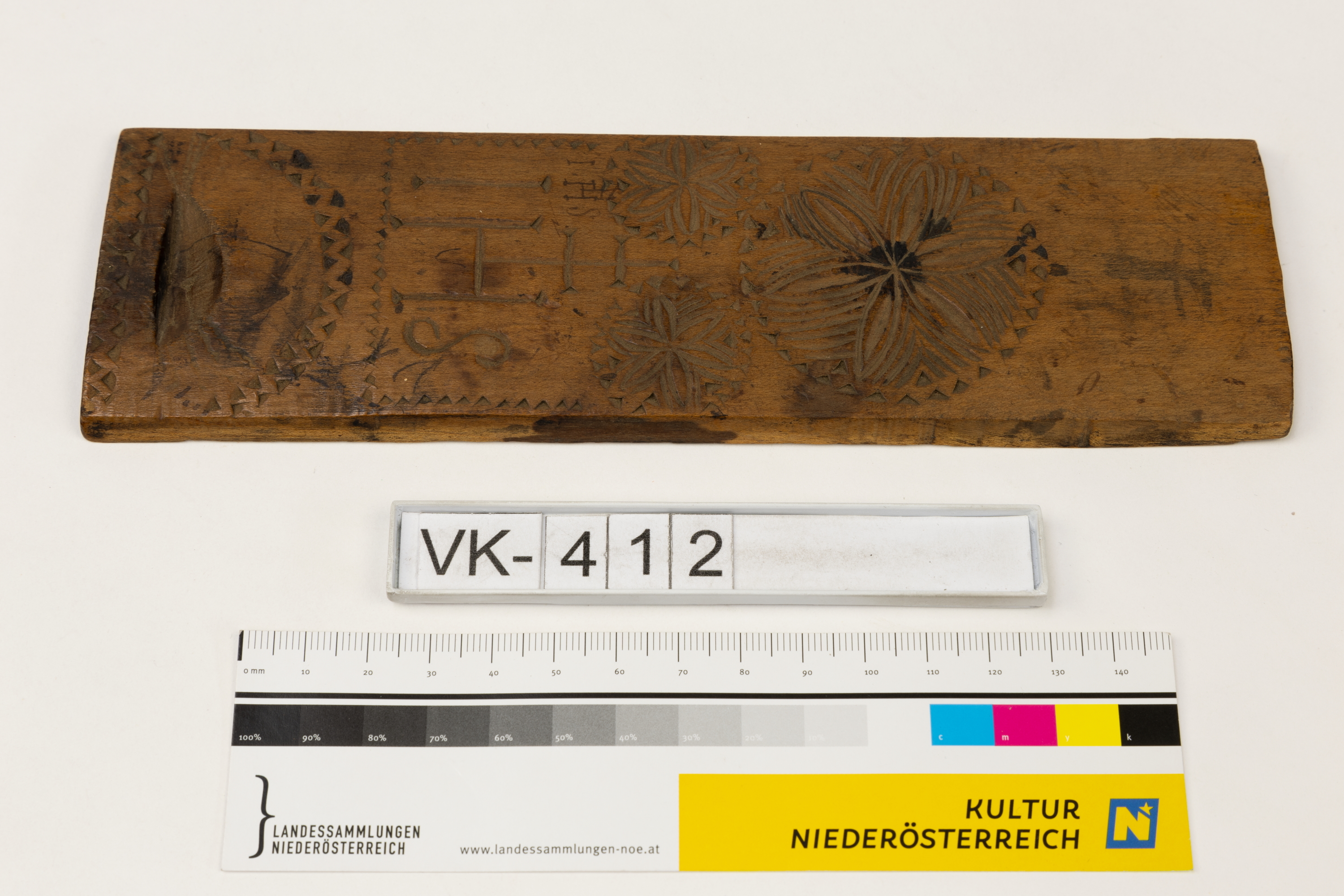 Beschnitzter Einschubdeckel mit drei Blütenmotiven und einem Christusmonogramm IHS und weiteren Kerbschnitzereien. Der Deckel wird mit VK-741 aufbewahrt, passt aber nicht exakt; das ehemals als VK-412 geführte Pennal (VK-17987) passt schlechter dazu.