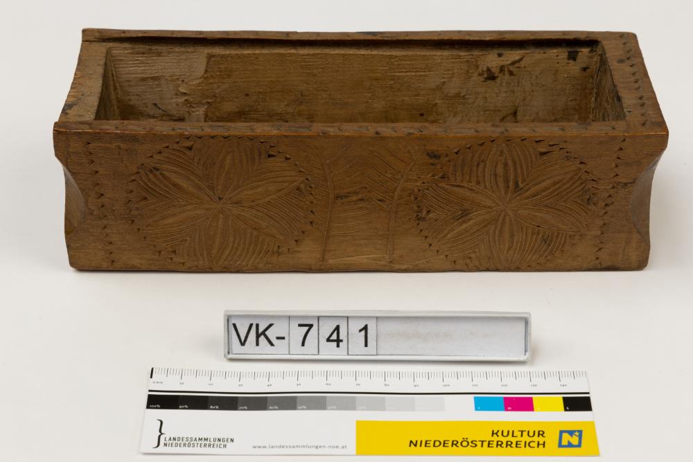 Knopfschachtel für einen Einschubdeckel mit Dekor: Blütenförmige Elemente, Initialen PB. Mit dem Objekte wird ein Einschubdeckel VK-412 aufbewahrt, der nicht exakt darauf passt.