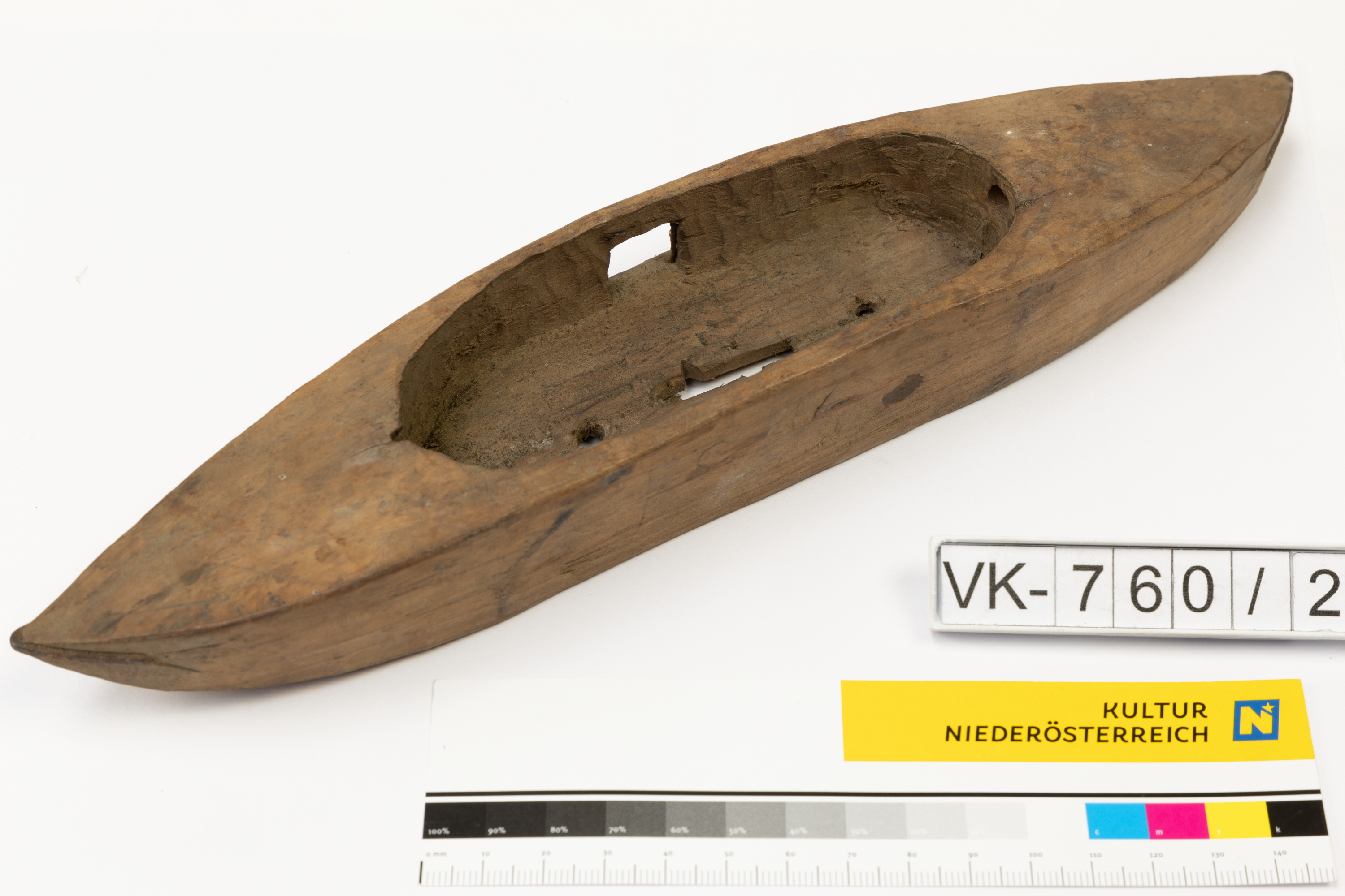 Webschiffchen mit Ausnehmung für eine Spule. Die Buchstaben "KF" sind eingeritzt.
