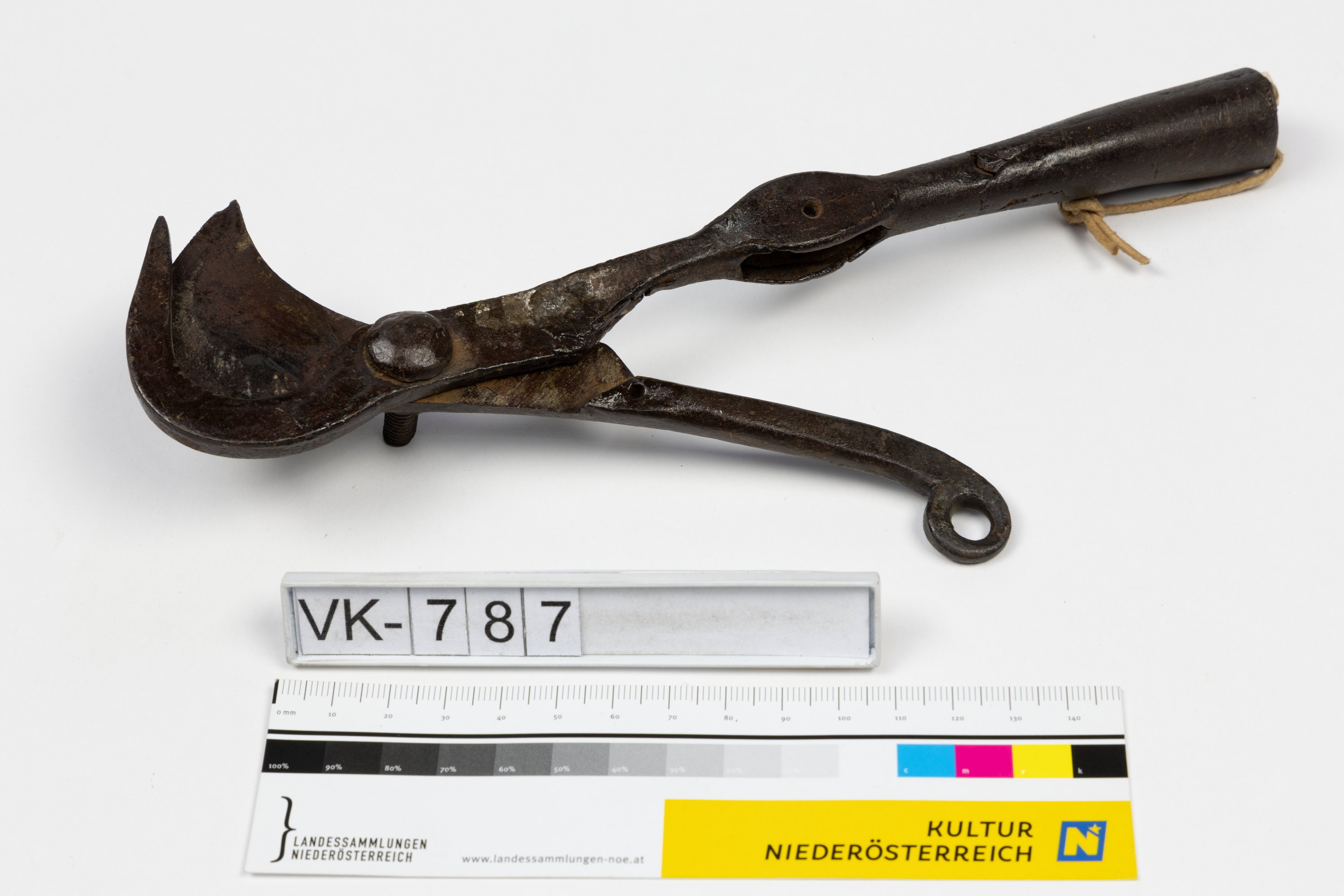Baumschere mit gebogenen Klingen und einer angeschmiedeten Tülle. Im Stiel befindet sich eine Aufnahmeöffnung für eine Umlenkrolle um die andere Klinge mit einem Seil über eine Öse betätigen zu können.