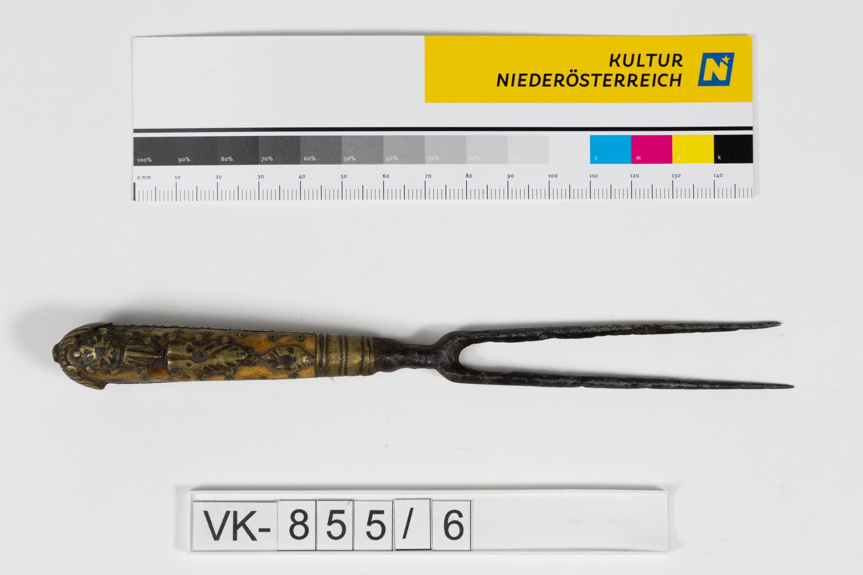 Zweizinkige Obstgabel mit Messinggriff, auf den zwei Horngriffschalen aufgenietet sind. Das Ende des Griffs und die Griffschalen sind mit ornamental verzierten Messingplättchen versehen.