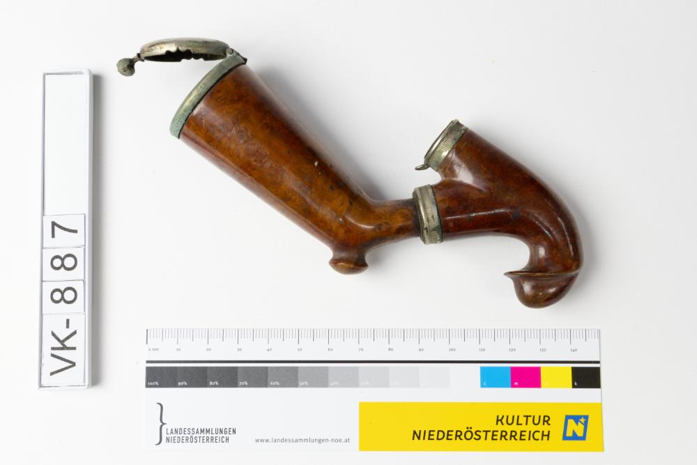 Aus Wurzelholz geschnitzter Pfeifenkopf mit Silberdeckel und einem ebenfalls aus Wurzelholz geschnitzten Wassersack mit mit Silber beschlagenen Abschlüssen.