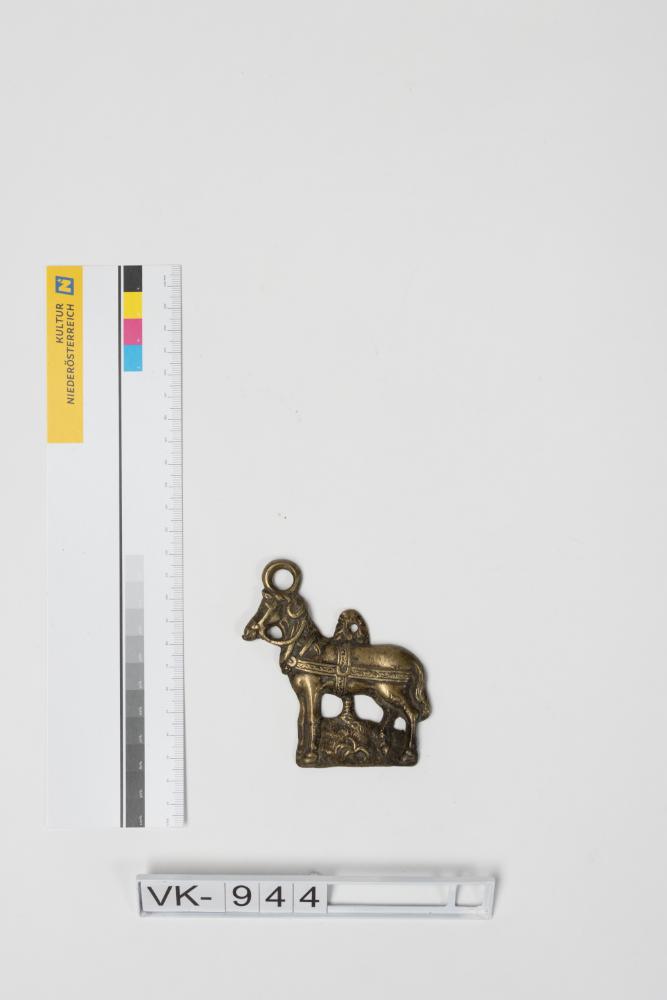 Kummetanhänger in Form eines Pferdes mit Zuggeschirr.