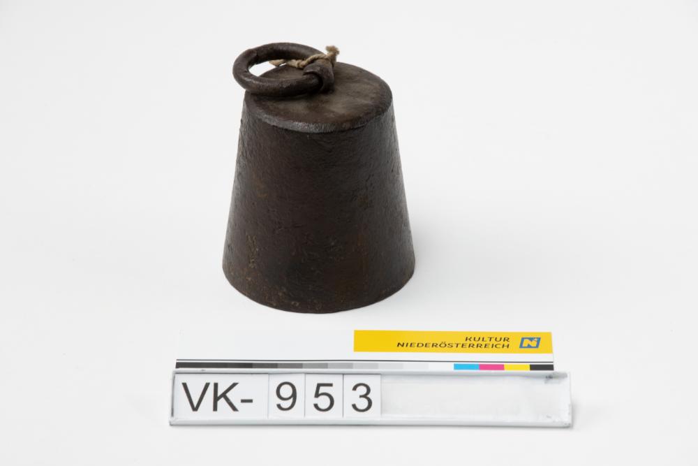 Großes, zylindrisches Eisengewicht mit einer Öse und einem Eisenring.